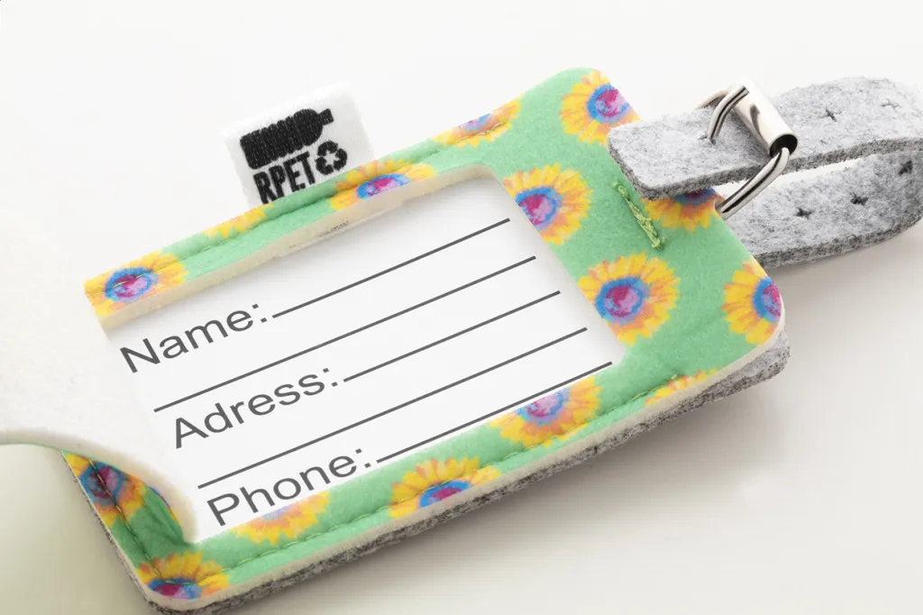 Izrađena po mjeri, RPET oznaka za prtljagu s otisnutom prednjom stranom u full color-u, kopčom i papirnatim umetkom. S prepoznatljivom RPET oznakom. Cijena uključuje sublimacijski tisak. Minimalna količina narudžbe: 50 kom.