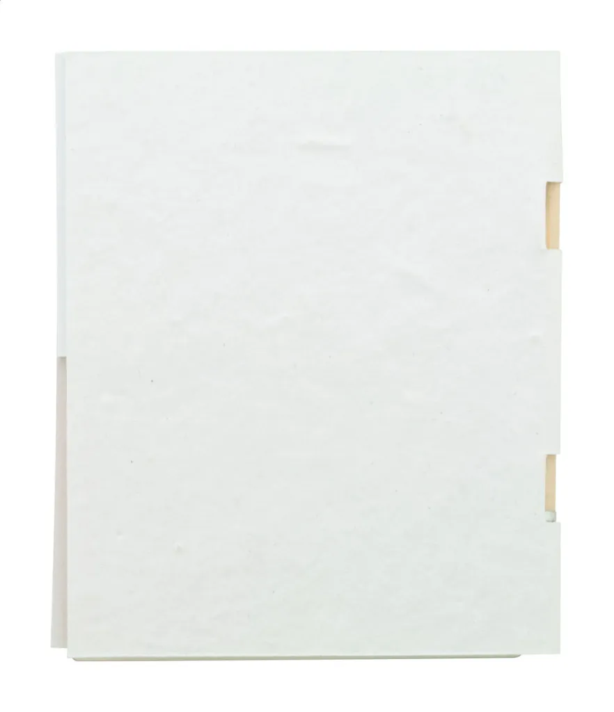 Personalizirani blokić s ljepljivim bilješkama, prekriven sjemenskim papirom i mini drvenom olovkom. Uključuje ljepljive bilješke od recikliranog papira u 2 veličine (50 listova 100×75 mm, 25 listova 50×75 mm) i 100 plastičnih folija za označavanje stranica u 5 različitih boja (12×44 mm). Cijena uključuje tiskane vanjske korice u boji. Minimalna količina za narudžbu: 100 kom. S različitim sjemenkama divljeg cvijeća.