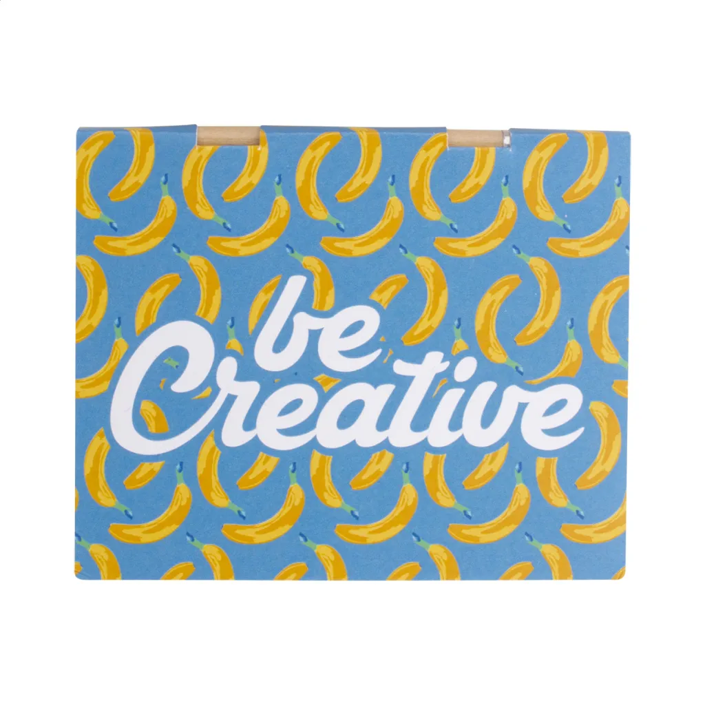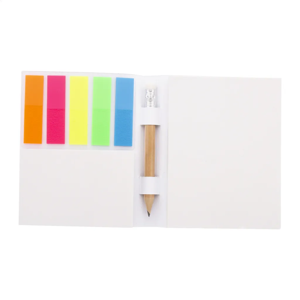 Personalizirani blok presvučen papirom sa samoljepljivim bilješkama i malom drvenom olovkom. Uključuje ljepljive bilješke od recikliranog papira u 2 veličine (50 listova 100×75 mm, 25 listova 50×75 mm) i 100 plastičnih folija za označavanje stranica u 5 različitih boja (12×44 mm). Cijena uključuje full color tisak preko vanjskih korica. Minimalna narudžba: 100 kom.