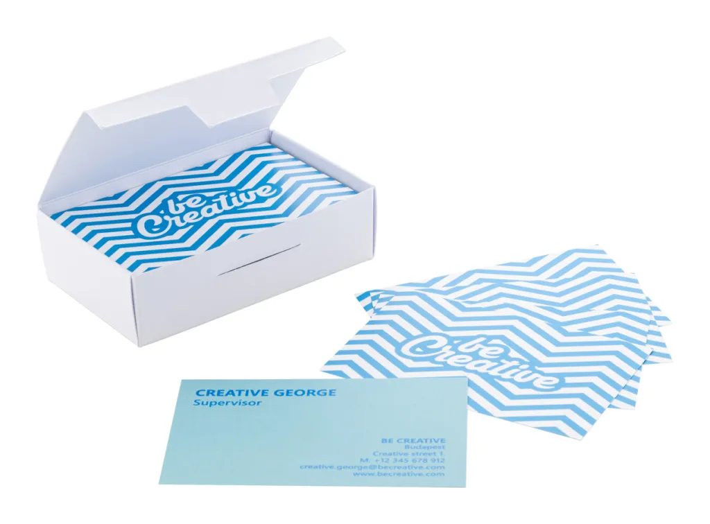 100 komada prilagođenih posjetnica od papira koji je otporan na vodu i kidanje, s full color tiskom s obje strane. Posjetnice dolaze u bijeloj papirnatoj kutiji. Cijena je za jednu kutiju od 100 komada.