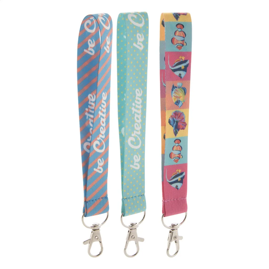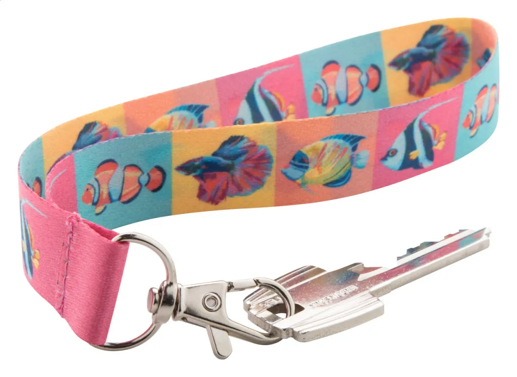 Poliesterski privjesak za ključeve (vezica) s metalnim karabinerom. Sublimacijski obostrani tisak. Minimalna količina za narudžbu: 100 komada.