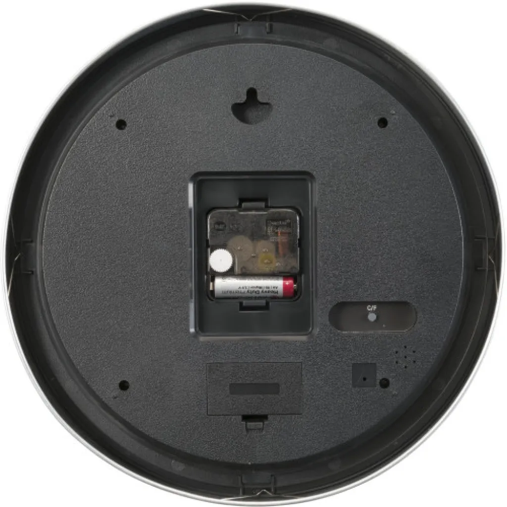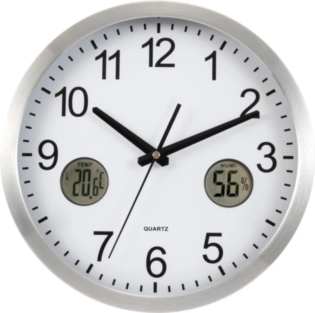 Plastični zidni sat s glatkom okretnom sekundnom kazaljkom i dvije digitalne funkcije na brojčaniku; sobni termometar i higrometar. Baterije uključene. Prodaje se po 10 komada.