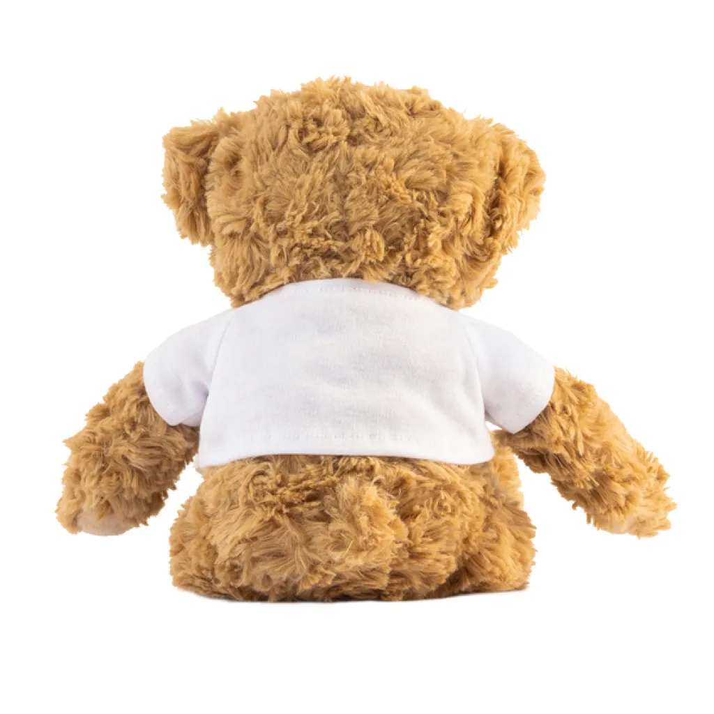 Plišani medvjedić će vas podsjetiti na davne trenutke iz djetinjstva. Medvjedić nosi bijelu majicu.