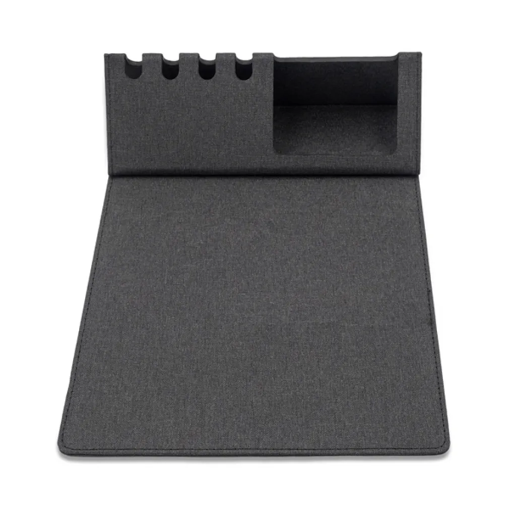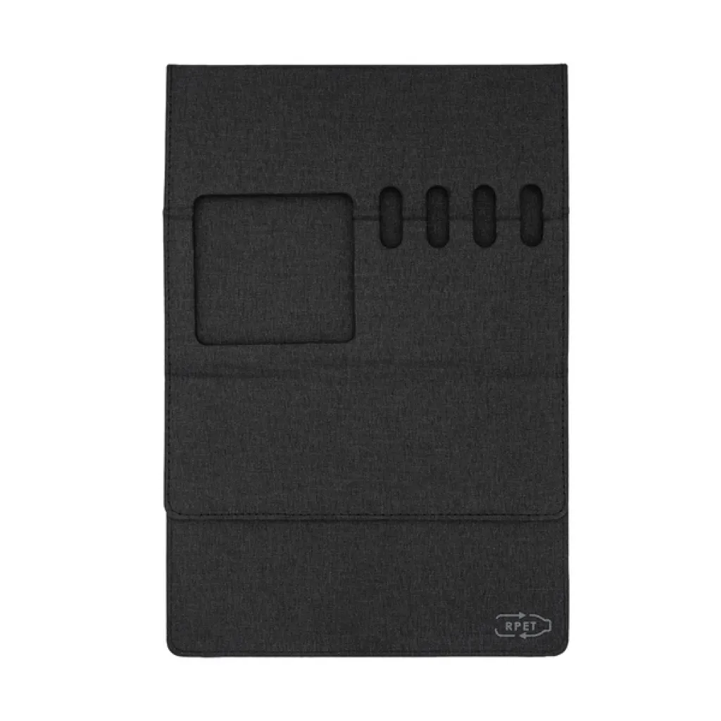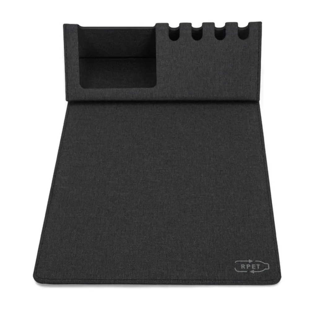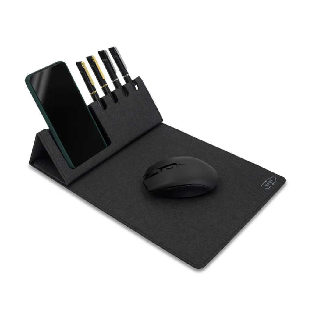 Sklopiva podloga za miš izrađena od RPET materijala. Ima stalak za mobitel i držače za četiri olovke.