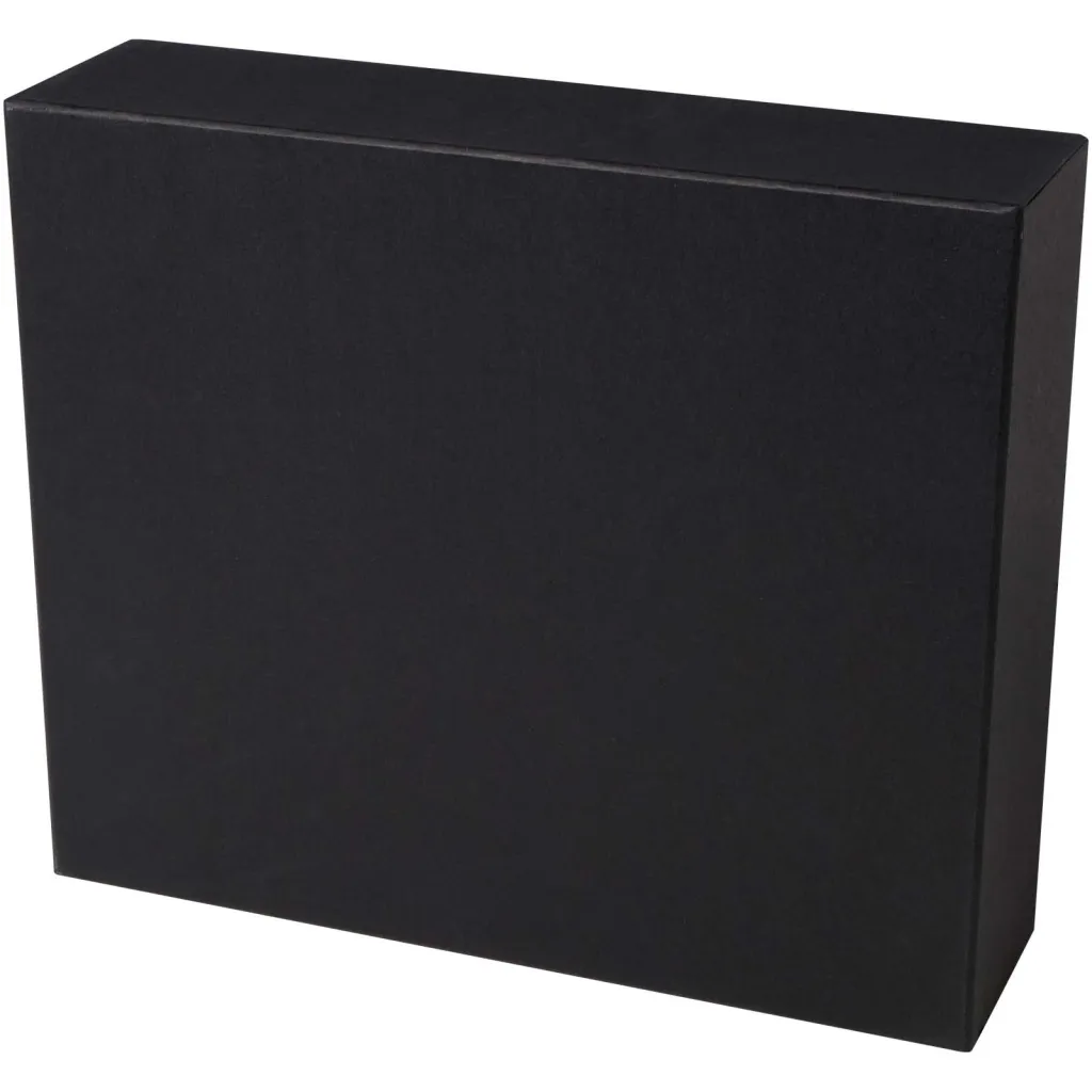 Poklon set Laura uključuje A5 notes s tvrdom koricom od RPET materijala, kemijsku olovku, keramičku šalicu i podložak za šalicu. Notes ima crni elastični zatvarač, traku za označavanje stranica i 80 listova krem boje papira težine 80 g/m². Korica notesa zajedno s bambusovim polukrugom služi kao stalak za telefon. Kemijska olovka izrađena je od RCS certificiranog recikliranog aluminija s crnim sprej premazom te bambusovim detaljima na oba kraja gornjeg dijela olovke. Tinta olovke je crna, a duljina pisanja iznosi 400 metara. Keramička šalica zapremine 480 ml dolazi s bambusovim podloškom. Preporučuje se ručno pranje. Dimenzije šalice su 11 x 12,7 cm, a promjer podloška 9,5 cm. Poklon kutija dimenzija je 32 x 27 x 10,3 cm.