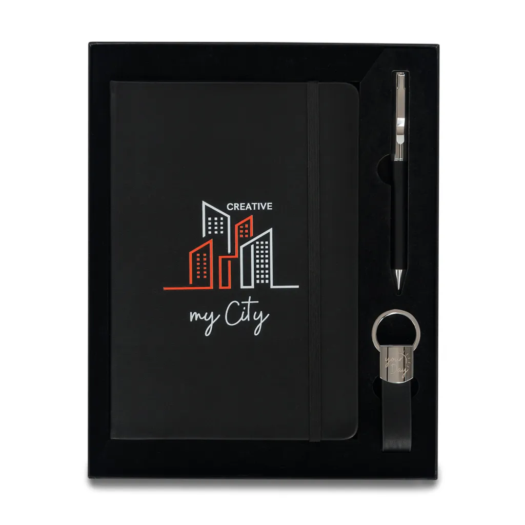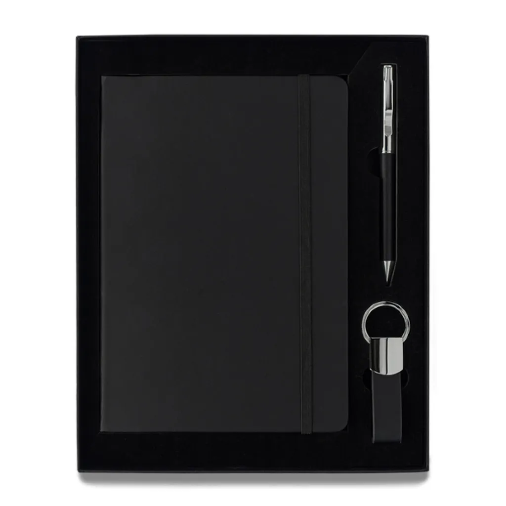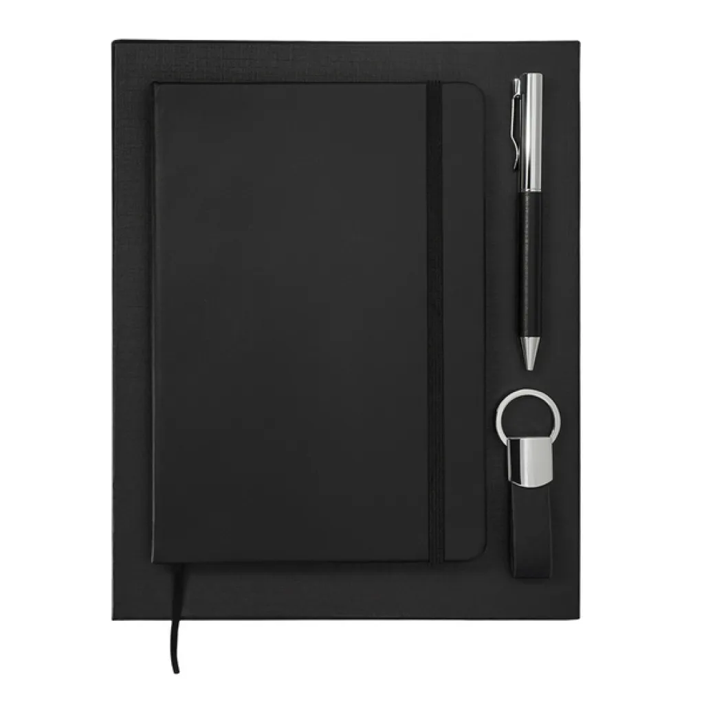 Poklon set koji se sastoji od A5 notesa, kemijske olovke i privjeska za ključeve.