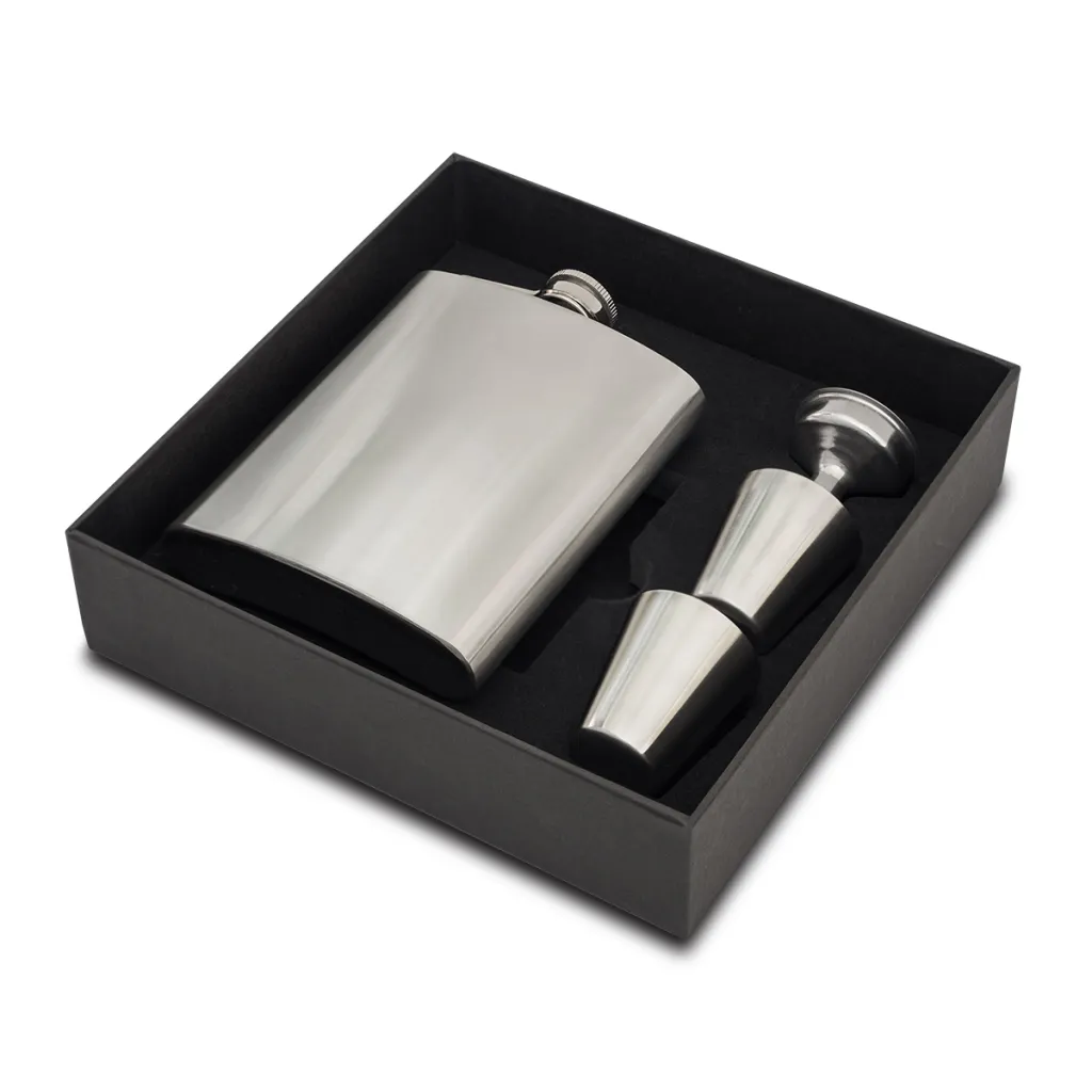 Set se sastoji od pljoske od nehrđajućeg čelika, dvije čašice i lijevka, kapaciteta 230 ml. Dolazi u crnoj poklon kutiji.