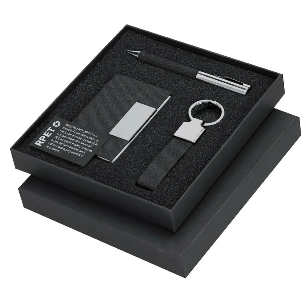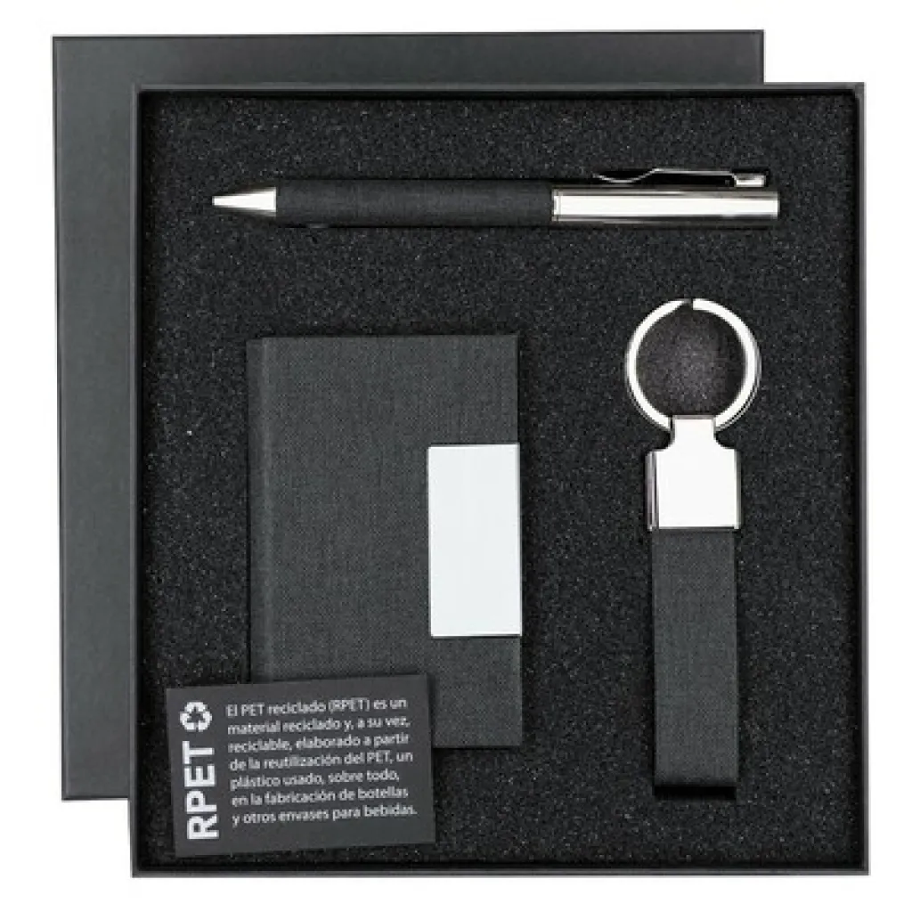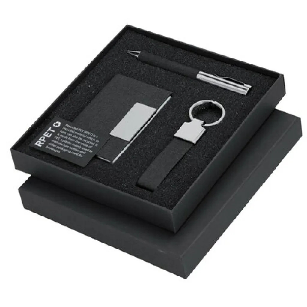 Poklon set sadrži privjesak za ključeve i držač za kreditne kartice s jednim pretincem, kemijsku olovku s plavom tintom i crnu poklon kutiju. Proizvod je izrađen od RPET-a i metala.