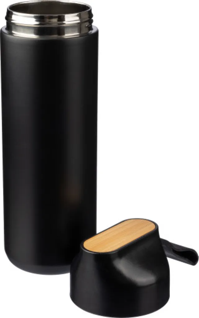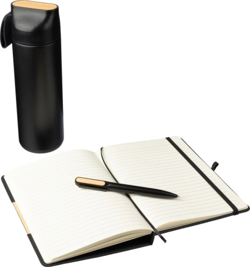 Poklon paket od crnog kartona uključuje 3 artikla: vakuumsku bocu od nehrđajućeg čelika s dvostrukim stijenkama (640 ml) s PP poklopcem, silikonskim remenom i bambusovim detaljem na vrhu. Unutrašnjost je od nehrđajućeg čelika 304, izvana od nehrđajućeg čelika 201; aluminijska kemijska olovka s mat završetkom, plavim tintom i bambusovim detaljem na kopči; i rPET (300D) bilježnica/notesom (cca. A5) s 80 stranica u crte i sklopivim omotom koji se pretvara u držač za telefon, s detaljem od bambusa na omotu.