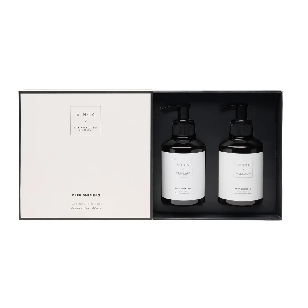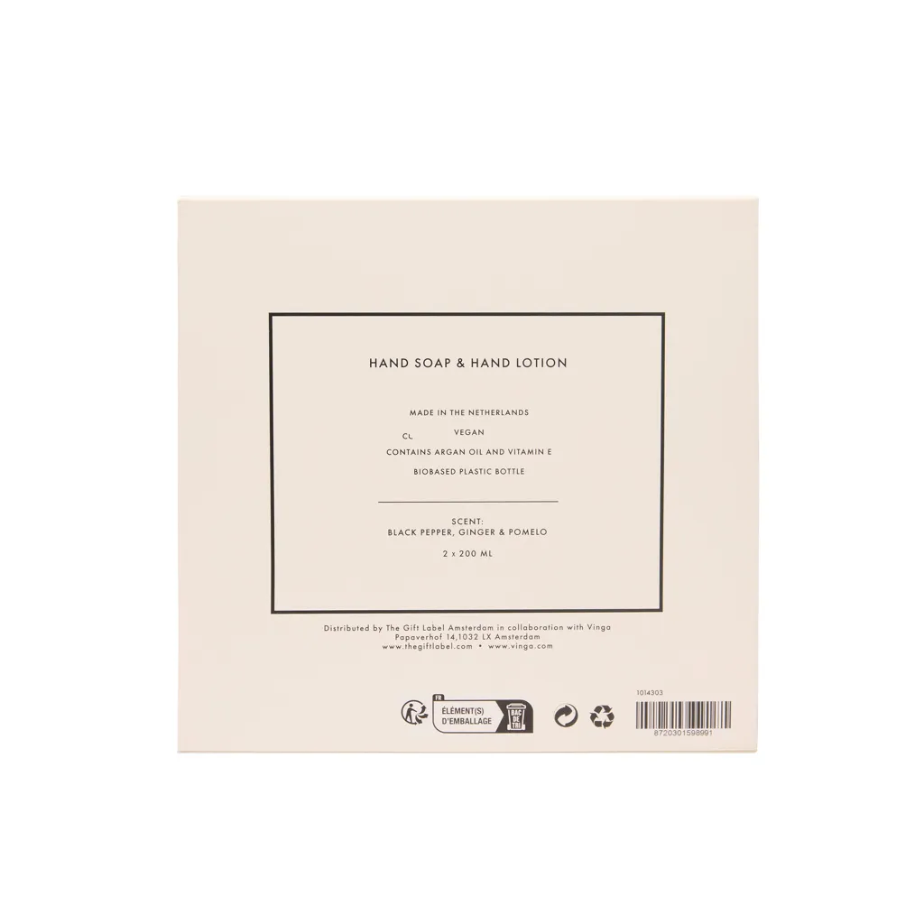 Svilenkasto glatke ruke, svaki dan. Njegujte svoje ruke ovim prekrasno mirisnim setom koji sadrži dvije bočice od 200 ml - sapun za ruke i losion za ruke. S toplom, pikantnom aromom crnog papra, đumbira i pomela, ostavlja vaše ruke glatkima, nahranjenima i suptilno mirisnima. Dodir koji će ljudi pamtiti. Elegantno pakirano u poklon kutiji u krem bijeloj i crnoj boji.