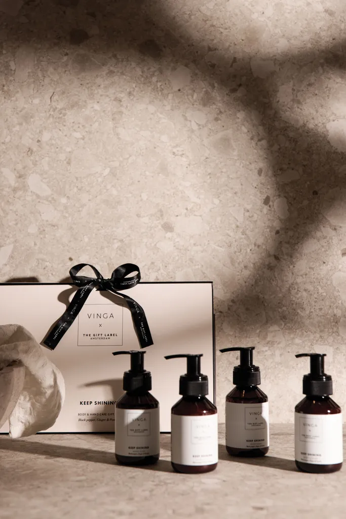 Njegujte tijelo, ruke i um. Ovaj mirisni set uključuje četiri bočice od 100 ml: gel za tuširanje, losion za tijelo, sapun za ruke i losion za ruke. S toplom i pikantnom aromom crnog papra, đumbira i pomela, ovaj set za njegu tijela i ruku oduševljava osjetila i dodaje vizualno privlačan dodir vašoj kupaonici. Elegantno pakirano u poklon omotnicu u krem bijeloj i crnoj boji.