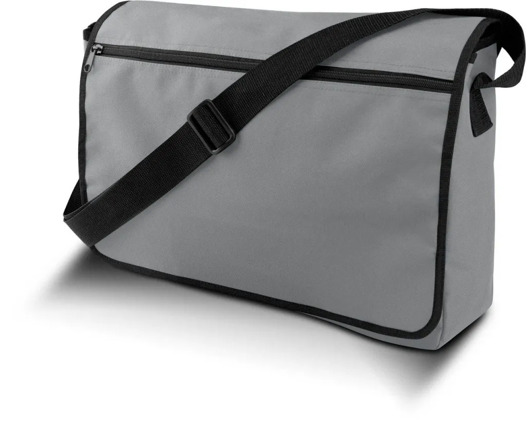 Glasnička torba od 600D poliestera s PVC podlogom. Prednji poklopac s džepom na patentni zatvarač. 2 pretinca. Džep s patentnim zatvaračem sprijeda.