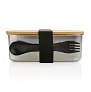 Uživajte u zdravom ručku bez poteškoća u pokretu s elegantnom kutijom za ručak od nehrđajućeg čelika s poklopcem od bambusa. Uključuje praktičnu elastičnu traku i žicu/vilicu. Kutiju za ručak nije moguće staviti u mikrovalnu pećnicu i pećnicu. Samo pranje ruku. Kapacitet 1,5 litre.