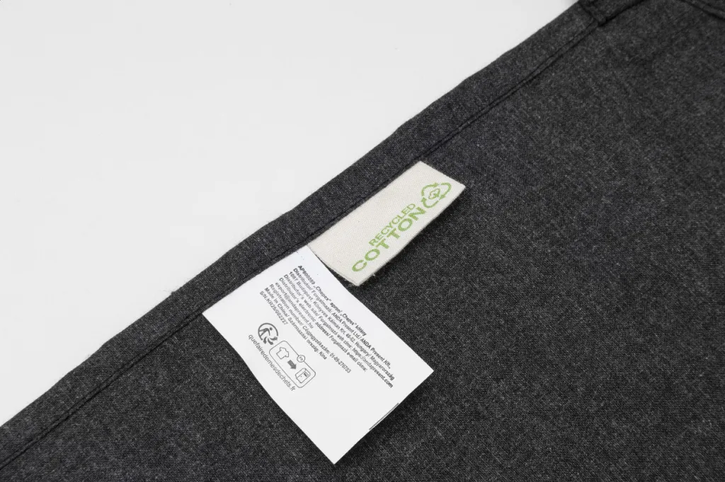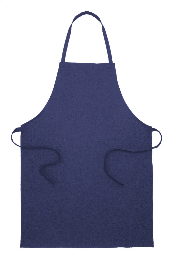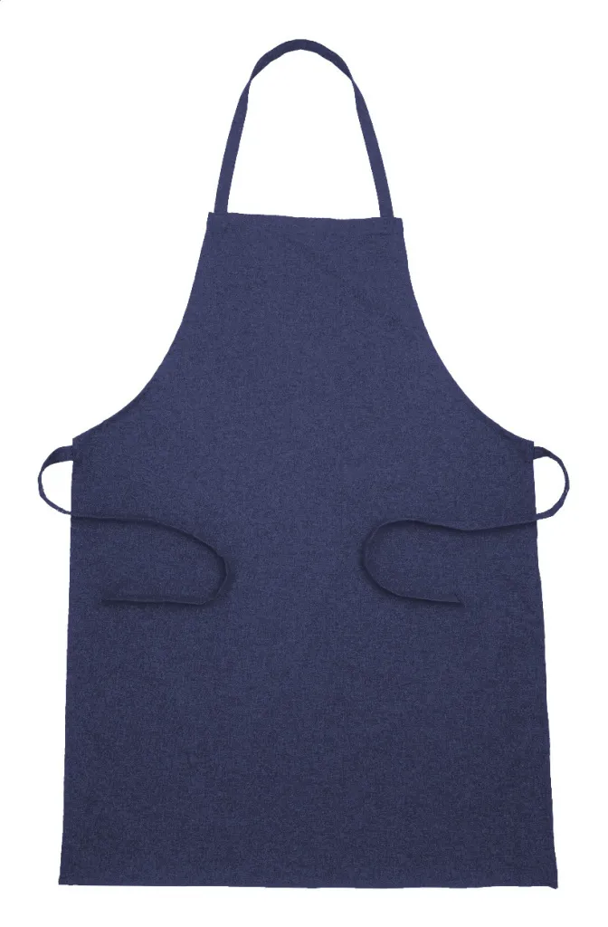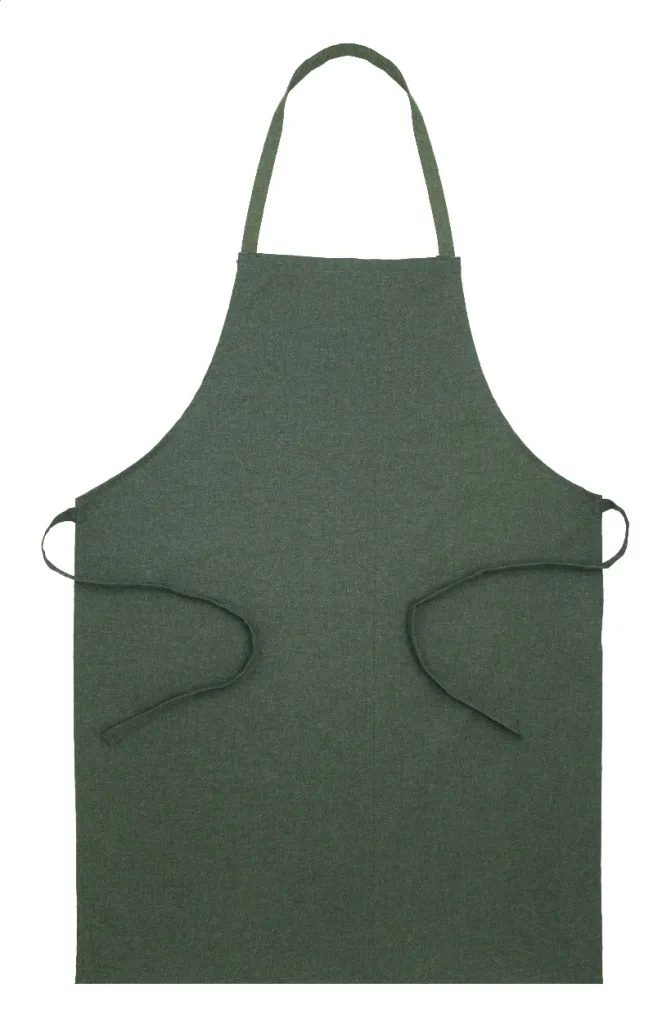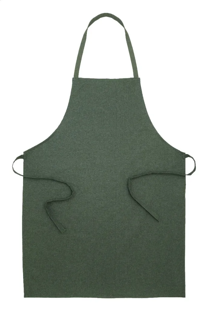 Kuhinjska pregača od 70% recikliranog pamuka i 30% RPET poliestera, 180 g/m². S prepoznatljivom etiketom od recikliranog pamuka.
