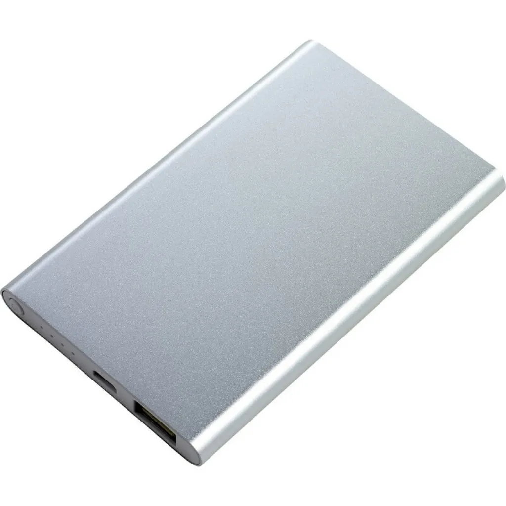 Prijenosna baterija (powerbank) od 4000 mAh s tipkom za uključivanje/isključivanje i diodama koje pokazuju razinu snage, ulaz 5V/1A, izlaz 5V/1A, USB kabel uključen.