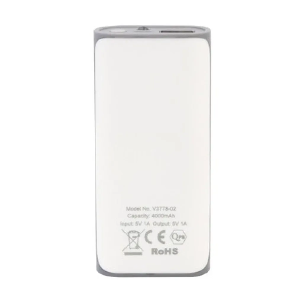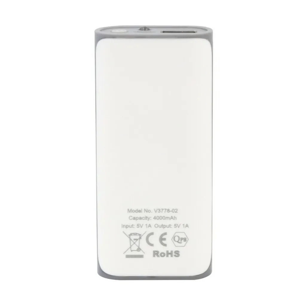 Prijenosna baterija (powerbank) od 4000 mAh, izlaz 5V/1A, ulaz 5V/1A, 4 diode koje pokazuju razinu snage, LED svjetlo, mikro USB kabel uključen.