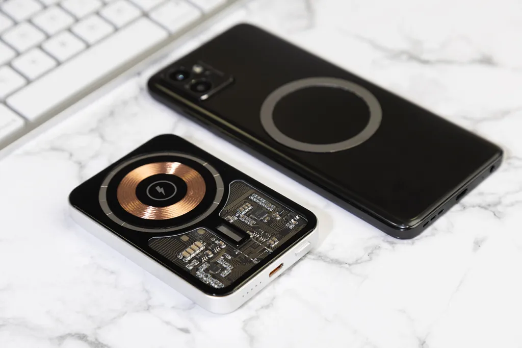 Powerbank od recikliranog aluminija s poluprozirnim kućištem i vidljivim elektroničkim komponentama. S baterijom od 5.000 mAh i ugrađenim magnetnim bežičnim brzim punjačem (15 W). S USB-C ulazom i priključkom za punjač. Uključuje samoljepljivi metalni prsten za korištenje magnetne funkcije na bilo kojem uređaju koji se može puniti bežično. Kompatibilan s iPhone® 12 ili novijim. Uključuje i USB kabel za punjenje.