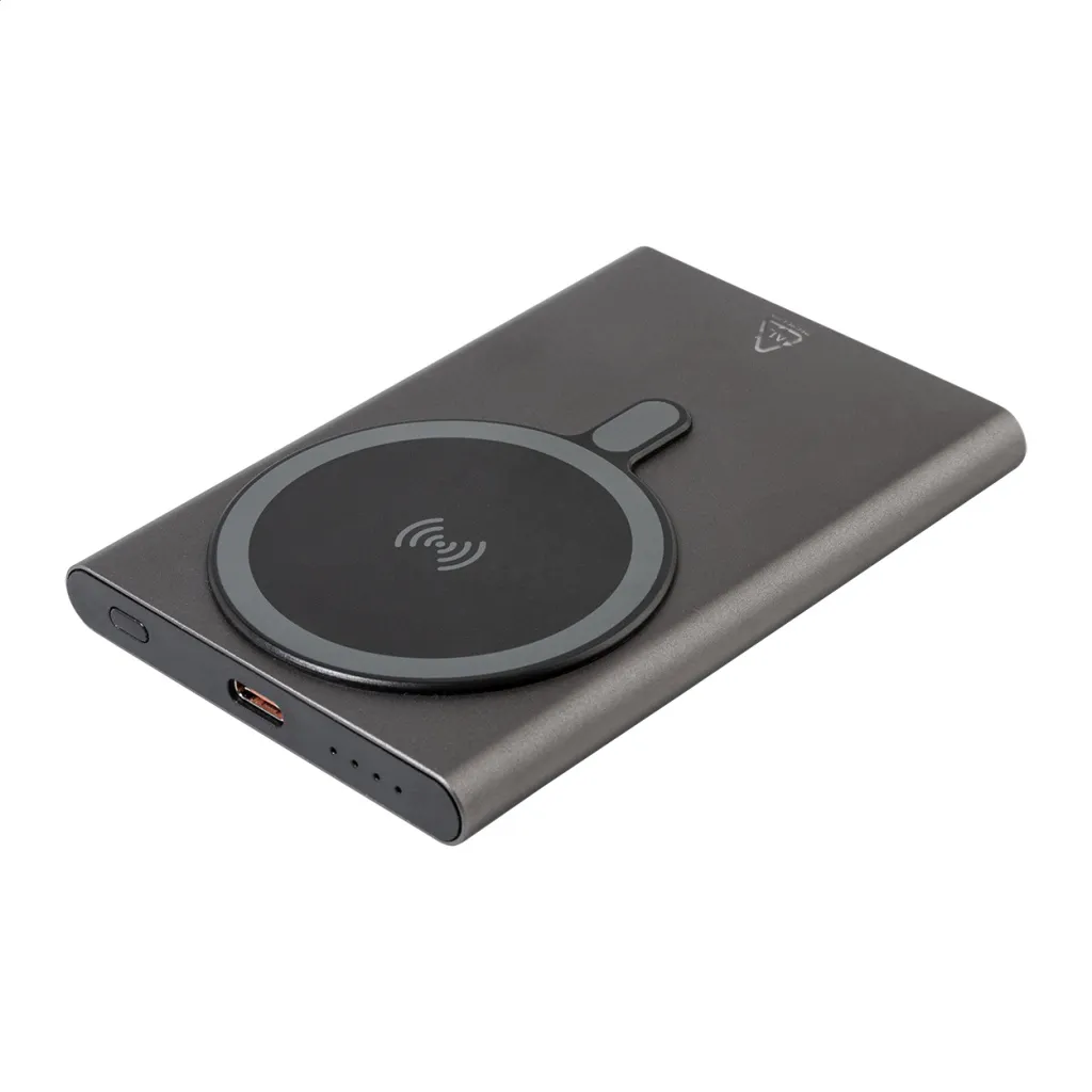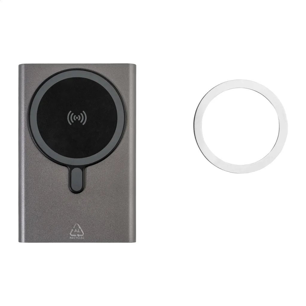 Powerbank od recikliranog aluminija s ugrađenim magnetskim bežičnim brzim punjačem (15 W) i baterijom od 5000 mAh. S USB-C ulazom i priključkom za punjač. Uključuje samoljepljivi metalni prsten za korištenje magnetske funkcije na bilo kojem uređaju koji se može puniti bežično. Kompatibilan s iPhone® 12 ili novijim. Uključuje i USB kabel za punjenje.