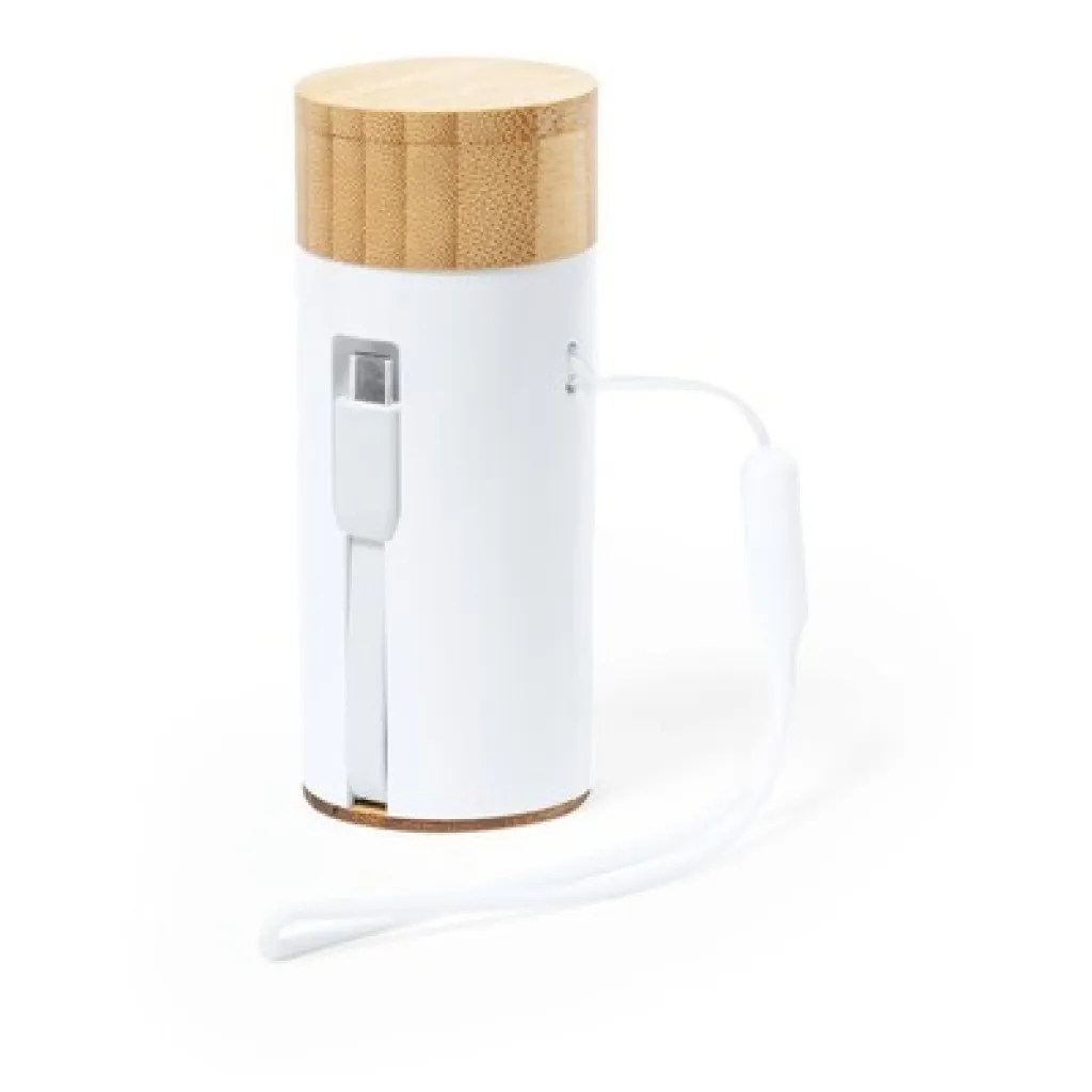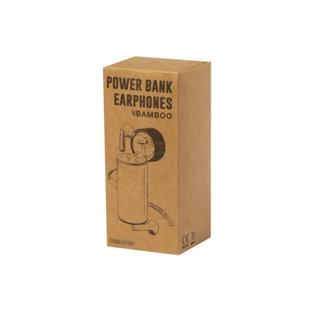 BT 5.0 powerbank od 4500 mAh s bežičnim slušalicama i detaljima od bambusa. Baterija za slušalice od 30 mAh. Može puniti dva uređaja istovremeno. USB izlaz, USB tip C ulaz/izlaz, integrirani kabel uključen.