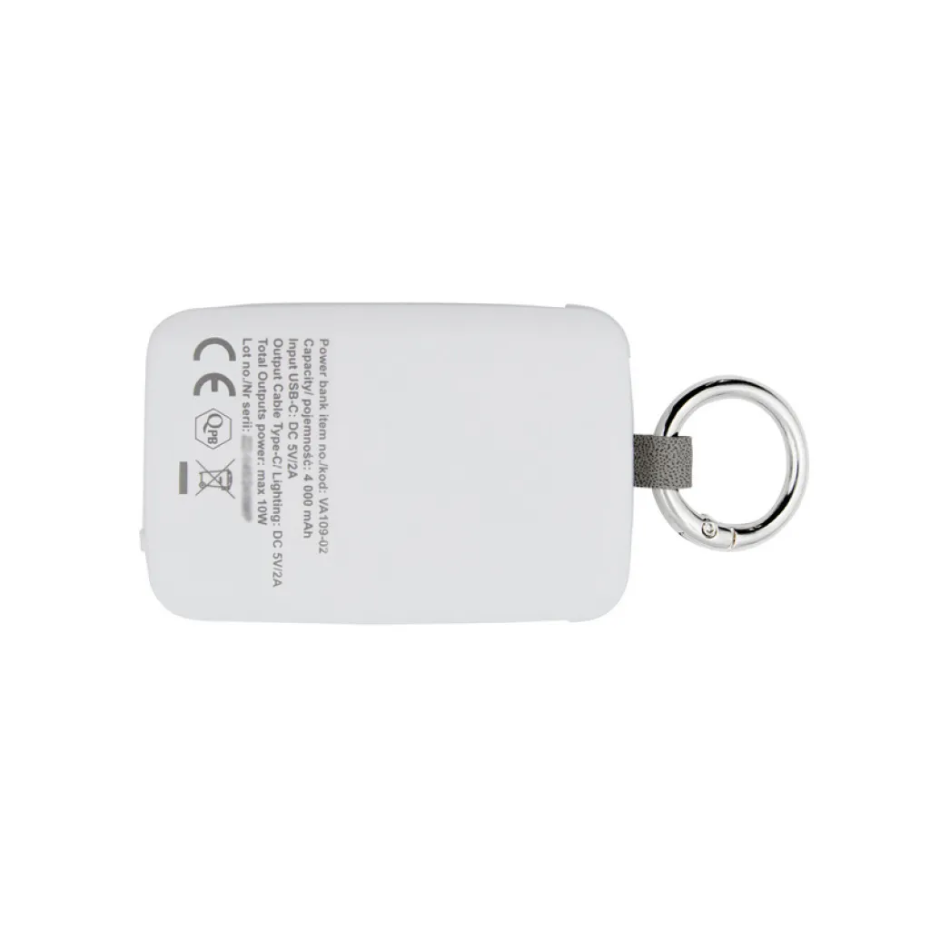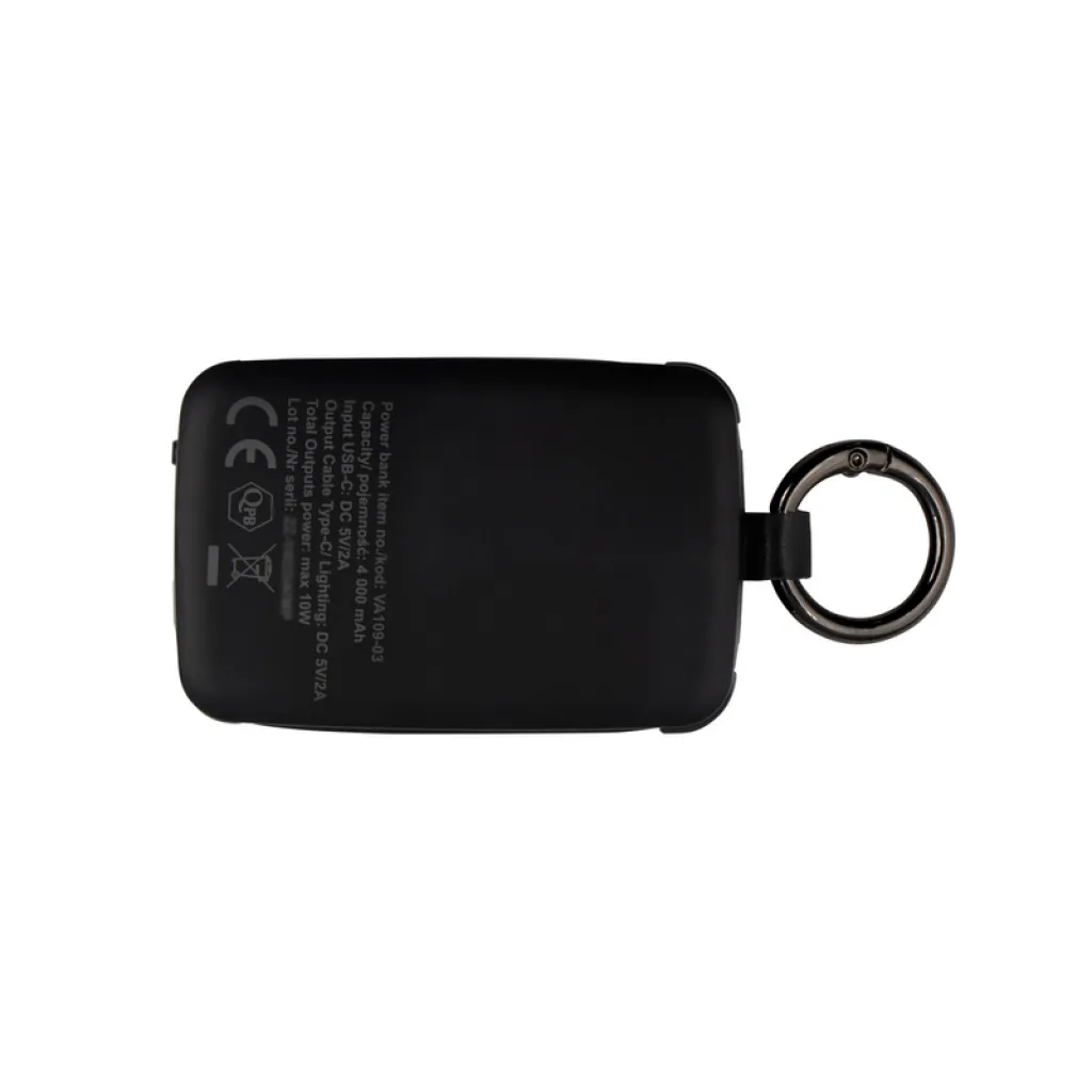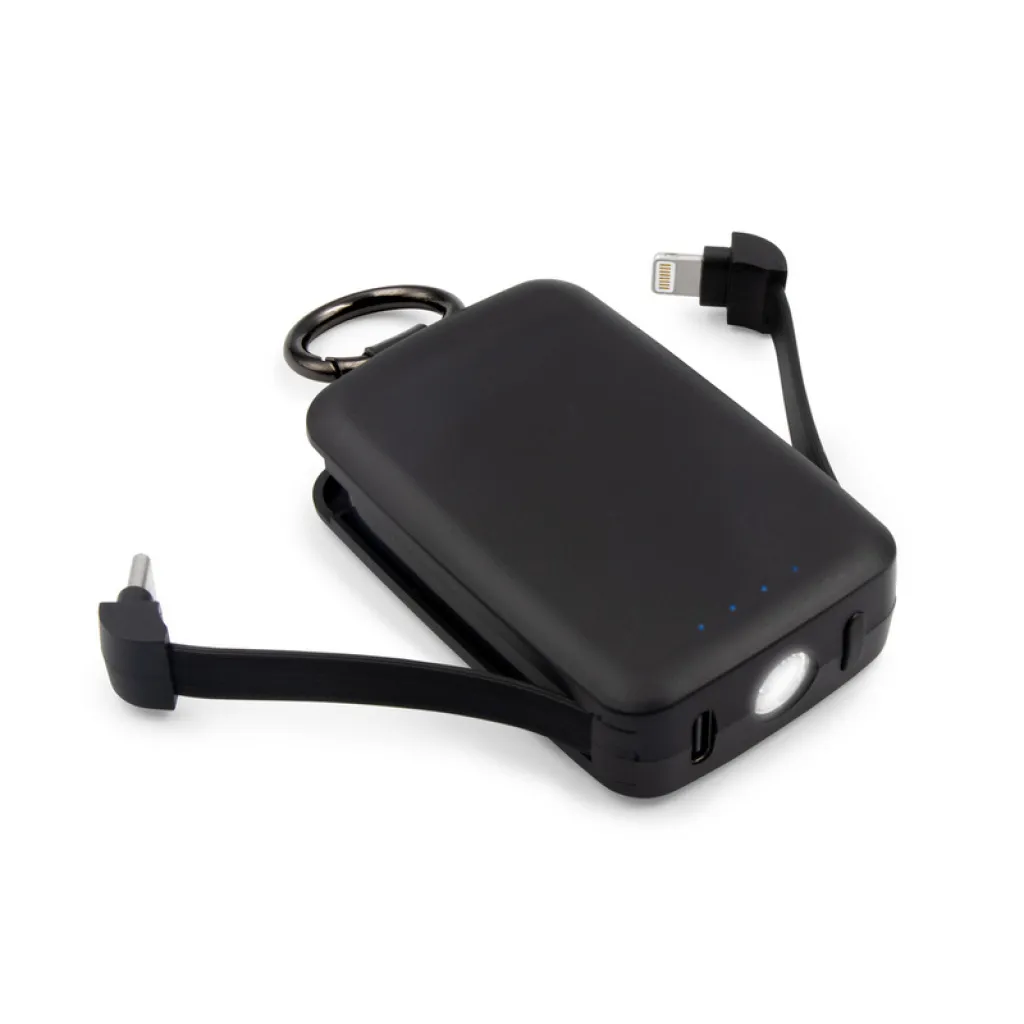 Powerbank 4.000 mAh s karabinerom za pričvršćivanje. Može stati u džep ili većinu pretinaca ruksaka. Ima ugrađeno svjetlo od 1W s tri razine osvjetljenja: snop svjetla (dvije razine) i bljeskajuće svjetlo (SOS signal). Dva integrirana kabela: USB-C i vrhom kompatibilnim s iOS uređajima što omogućuje istovremeno punjenje dvaju uređaja s različitim konektorima. Ima četiri diode koje pokazuju razinu snage, lampu vrijeme rada na jedan ciklus punjenja powerbanka: >24h. USB-C ulaz, uključen USB-C kabel. Proizvod izrađen od ABS-a i metala.