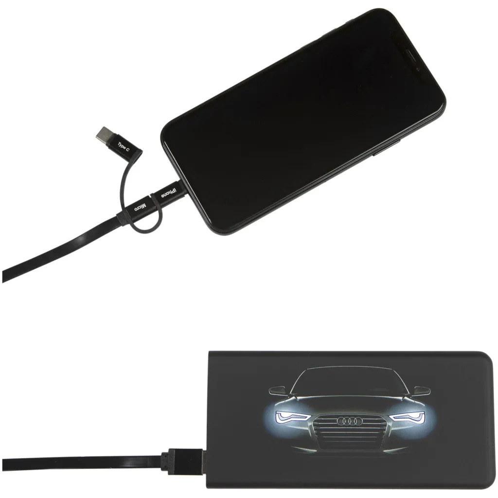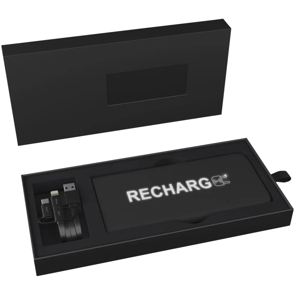 Izuzetno tanak i lagan gumirani powerbank sa svjetlećim logotipom i 3-u-1 kabelom od reciklirane PET plastike (Type-C, Android, iPhone). Uređaj svijetli na dodir zahvaljujući "shake funkciji", a logo može ostati upaljen do 20 dana bez ponovnog punjenja baterije. Kapacitet: 5.000 mAh. DC dvostruki izlaz: 5V/2A i 5V/2A brzo punjenje. DC ulaz: 5 V/2A mikro-USB. Neto težina: 110 grama. Veličina: 138 x 66 x 8,5 mm. Isporučuje se s poklon kutijom od recikliranog papira.