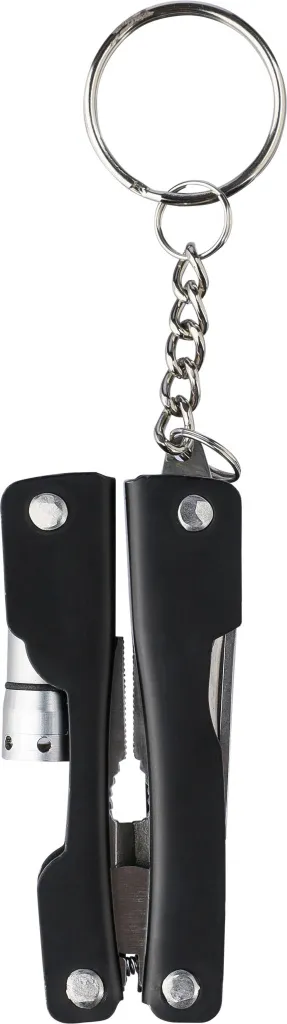 Sklopivi multi-alat od nehrđajućeg čelika s 10 funkcija. S jednom LED svjetiljkom. Pakirano u 600D poliestersku torbicu s čičak kopčom. Torbica koja se može pričvrstiti na remen. Uključujući baterije. Dolazi pojedinačno pakiran u smeđoj kartonskoj kutiji.