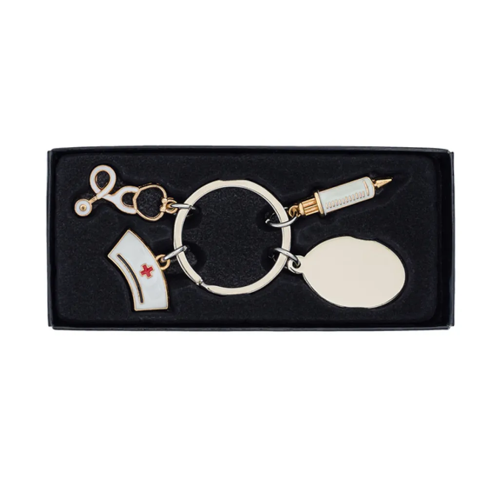 Metalni privjesak za ključeve sa medicinskim motivima. Sadrži 4 privjeska: kapu za medicinsku sestru, stetoskop i štrcaljku, kao i privjesak savršen za graviranje. U crnoj poklon kutiji.