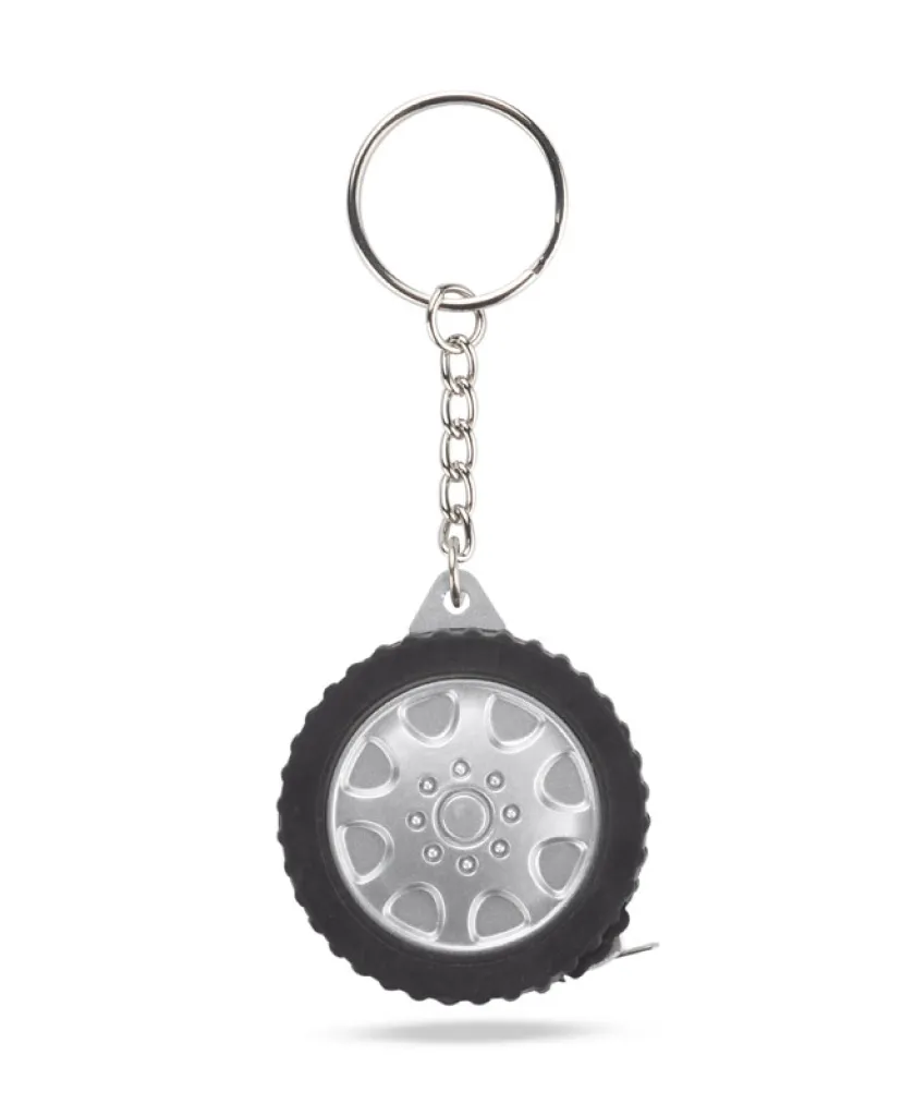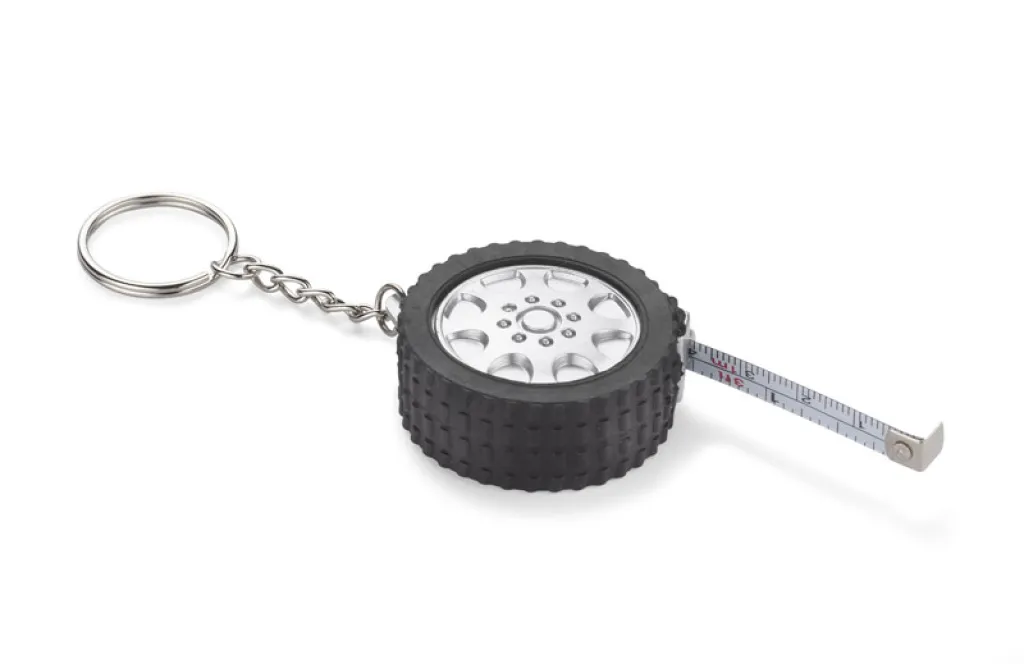 Plastični privjesak za ključeve u obliku automobilske gume s ugrađenim metrom duljine 1m. Na poleđini privjeska moguće je napraviti otisak.