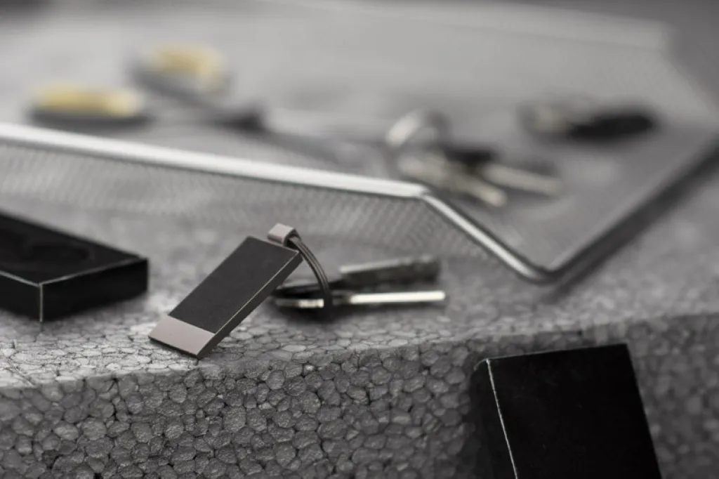 Metalni privjesak za ključeve od materijala ugodnog na dodir. Pakirano u karton. kutija