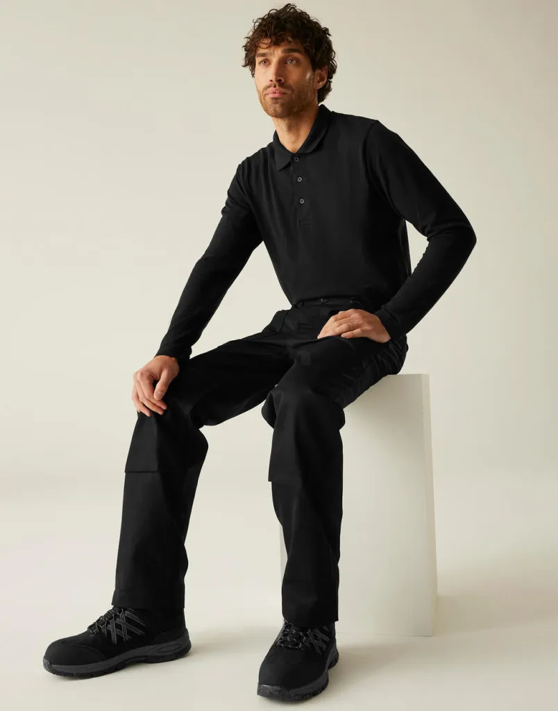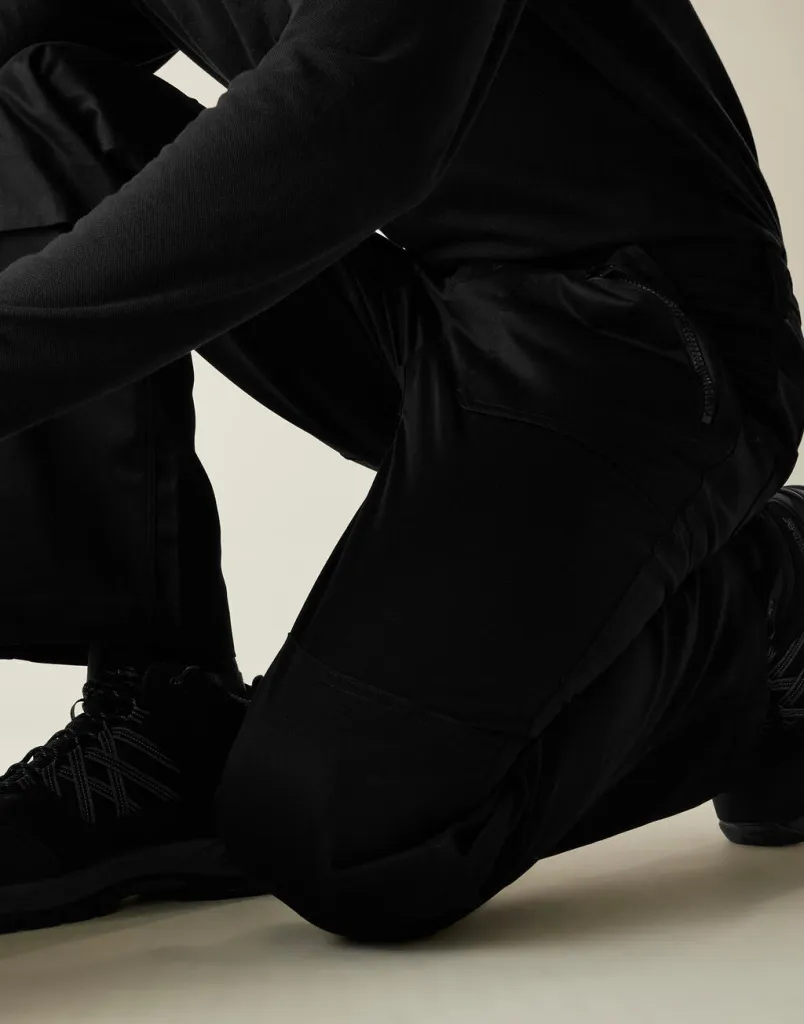 ·245 g/m² ·65% poliester, 35% pamuk ·Trajni vodoodbojni završni sloj ·Djelomično elastični struk s omčama za remen ·Šlic s patentnim zatvaračem ·Ojačani šavovi među nogama ·2 prednja džepa (1 s malim džepom za kovanice), džep s više patentnih zatvarača, bočni džep s patentnim zatvaračem, 2 stražnja džepa ·Džepovi na koljenima za umetanje štitnika za koljena ·Ojačani, trostruko prošiveni šavovi