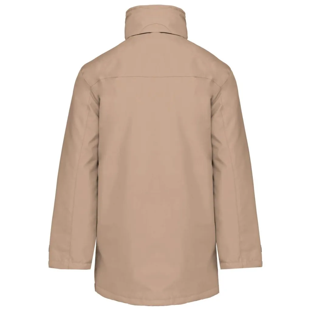 100% poliester. Oxfordska presvučena presvlaka od poliestera i podstava. Pričvršćivanje na patentni zatvarač sa kopčanjem i skrivenim prešama. 2 vanjska džepa s patentnim zatvaračem. 2 unutarnja džepa. 1 džep za mobitel. Skrivena kapa. Ovratnik obložen flisom.