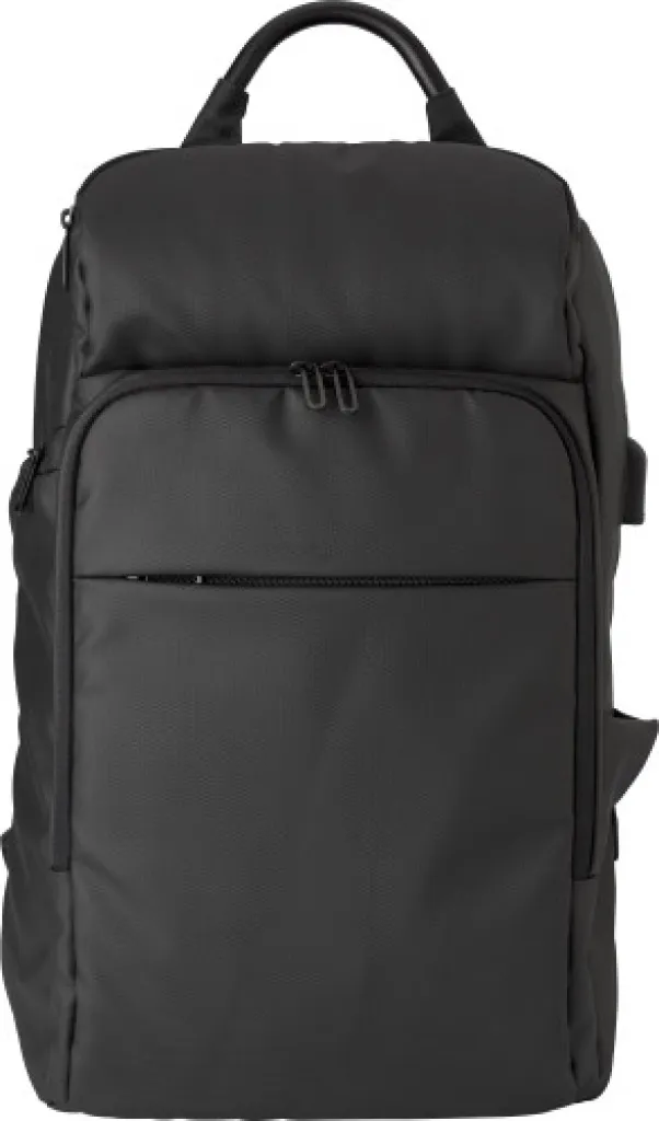Ruksak od 600D PU-a s džepovima na prednjoj strani, bočnim džepom izoliranim aluminijem i iznutra podstavljenim pretincem za prijenosno računalo od 15". Podstavljena leđa i podstavljene i podesive naramenice. Posebna značajka smanjenja težine i USB priključak i kabel.