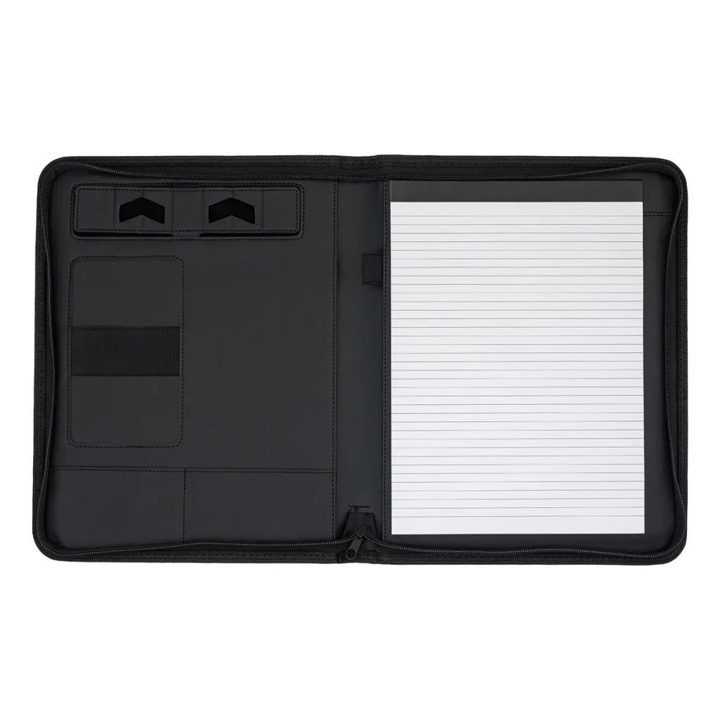 Elegantna A4 mapa od eko kože koja se zatvara na patentni zatvarač. Sadrži notes, dva mala džepa, fleksibilni držač za telefon i sklopivi stalak za telefon. Aktovka ima i petlju za olovku.