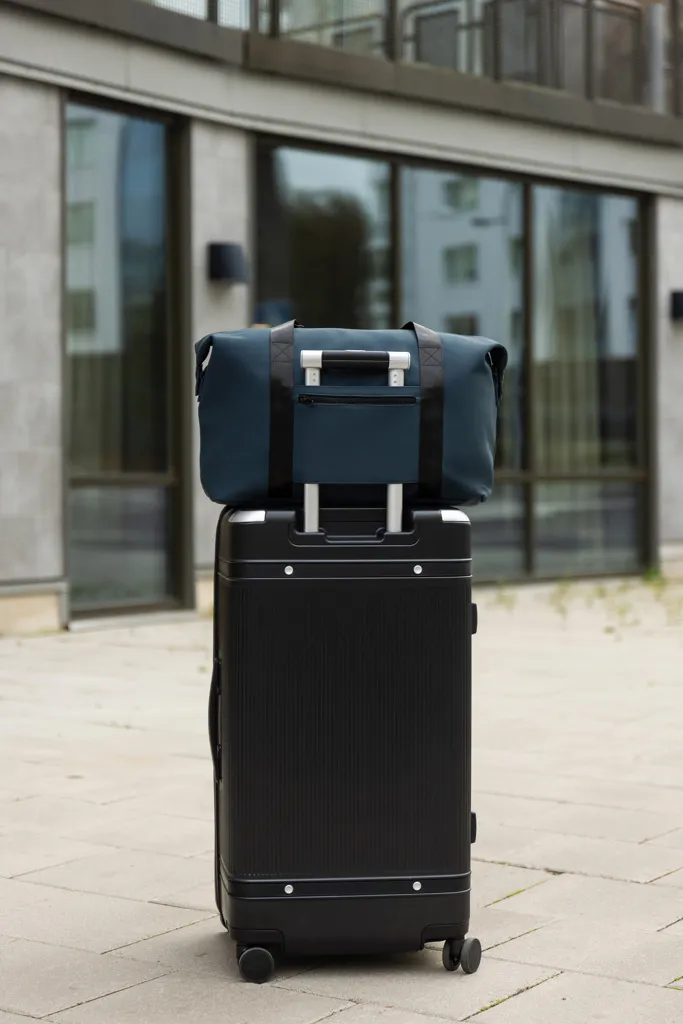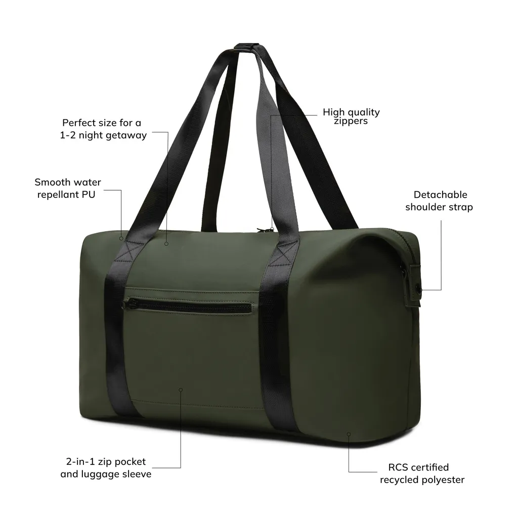 Vikend torba putne veličine izrađena od djelomično RCS certificiranog recikliranog poliestera s elegantnim PU premazom. Dizajnirana za smještaj svega što vam je potrebno za izlet od 1-2 noći. Jednostavno pričvrstite svoju torbu za kolica pomoću pametnog 2 u 1 džepa s patentnim zatvaračem. Sadrži udobne naramenice za nošenje u ruci i odvojivu podesivu naramenicu. S unutarnje strane sadrži manji džep s patentnim zatvaračem za vaše osnovne stvari. Certificiran od strane RCS (Recycled Claim Standard), RCS certifikat jamči da je cijeli opskrbni lanac recikliranih materijala certificiran. Ukupni reciklirani sadržaj temelji se na ukupnoj težini proizvoda. Ovaj proizvod sadrži 20% recikliranog poliestera s RCS certifikatom.
