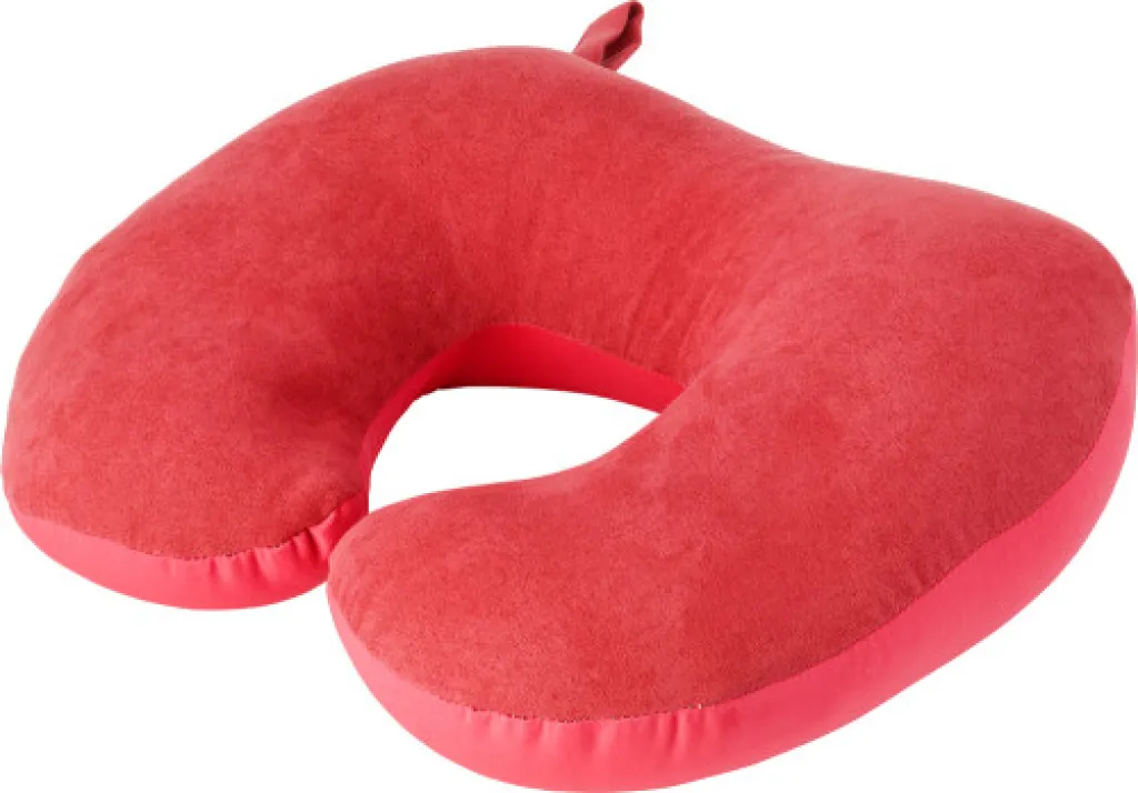 2u1 putni jastuk od materijala sa efektom brušene kožem, s polifoam kuglicama. Jastuk se može transformirati iz okruglog jastuka za vrat u pravokutni jastuk pomoću patentnog zatvarača. Tisak na etiketu jastuka.