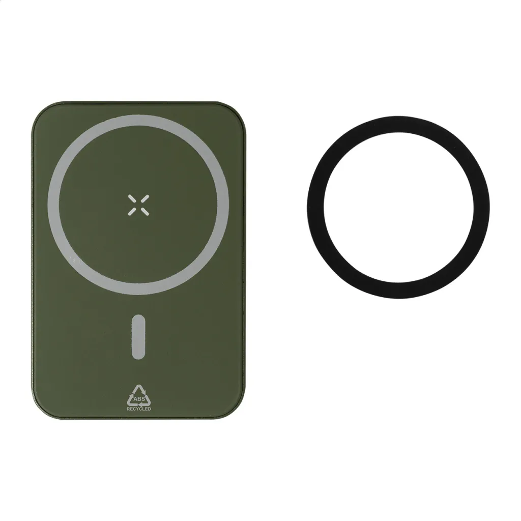 Powerbank od recikliranog ABS-a s baterijom od 5.000 mAh i ugrađenim magnetskim bežičnim punjačem (5 W). S USB-C ulazom i priključkom za punjač. Uključuje samoljepljivi metalni prsten za korištenje magnetne funkcije na bilo kojem uređaju koji se može puniti bežično. Kompatibilan s iPhone® 12 ili novijim. Uključuje i USB kabel za punjenje.