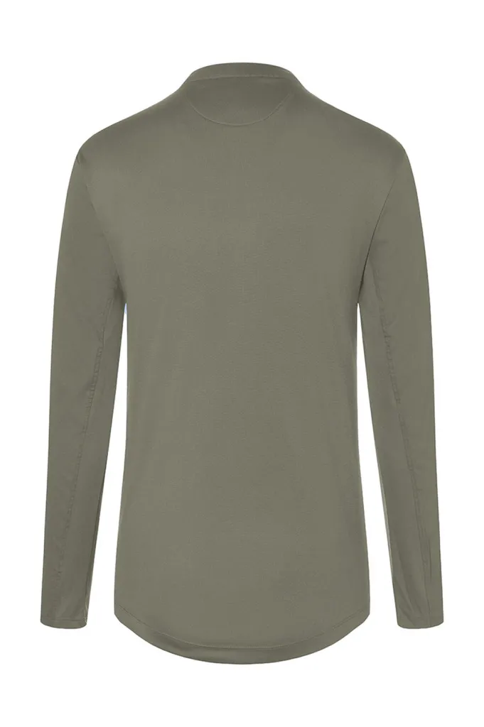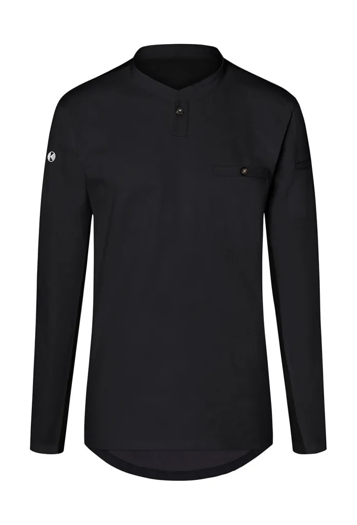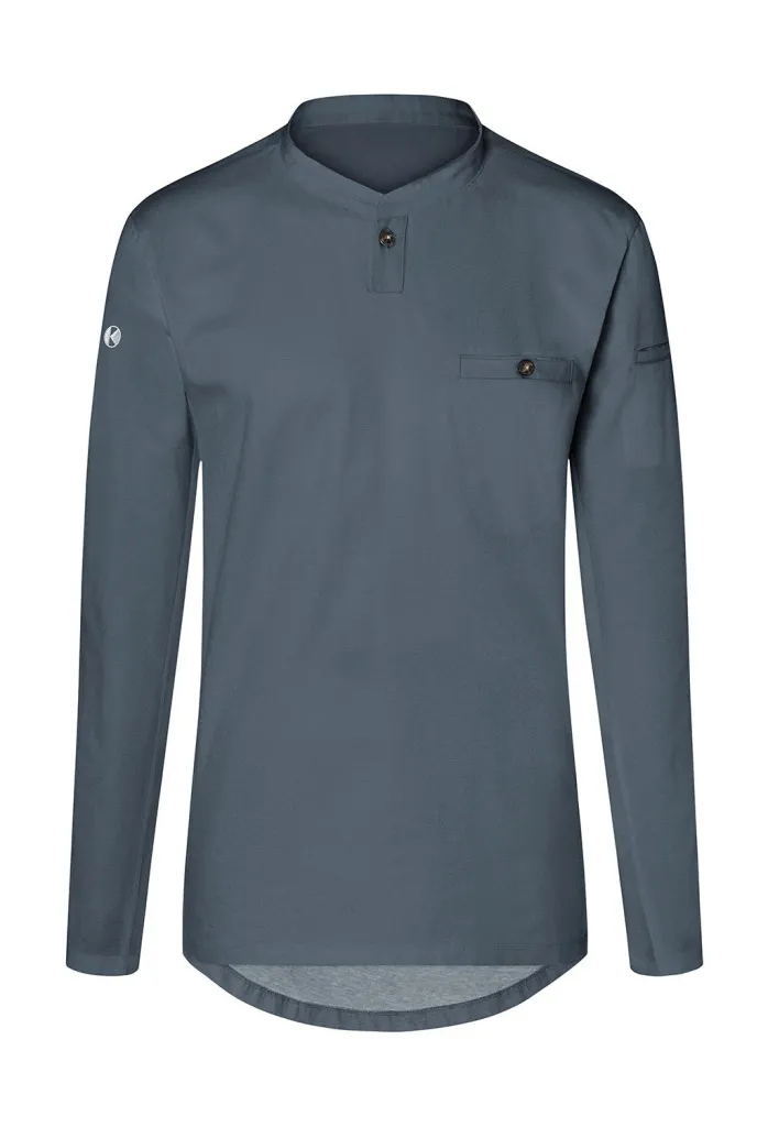·150 g/m² ·Prednji dio: 60% pamuk, 40% poliester (twill) ·Stražnji dio: 100% poliester (jersey piqué) ·Moderna radna majica dugih rukava sportskog, elegantnog izgleda ·Prozračni stražnji dio koji pomaže pri upijanju vlage ·Vratni izrez s uskim uspravnim ovratnikom i malom trakom s gumbom ·Našiveni džep na prsima s gumbom ·Našiveni džep na lijevom rukavu ·Pranje na temperaturama do 60°C ·Slim fit.