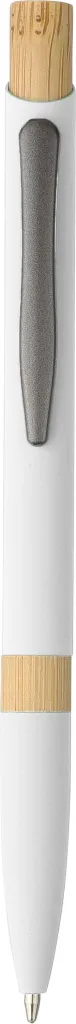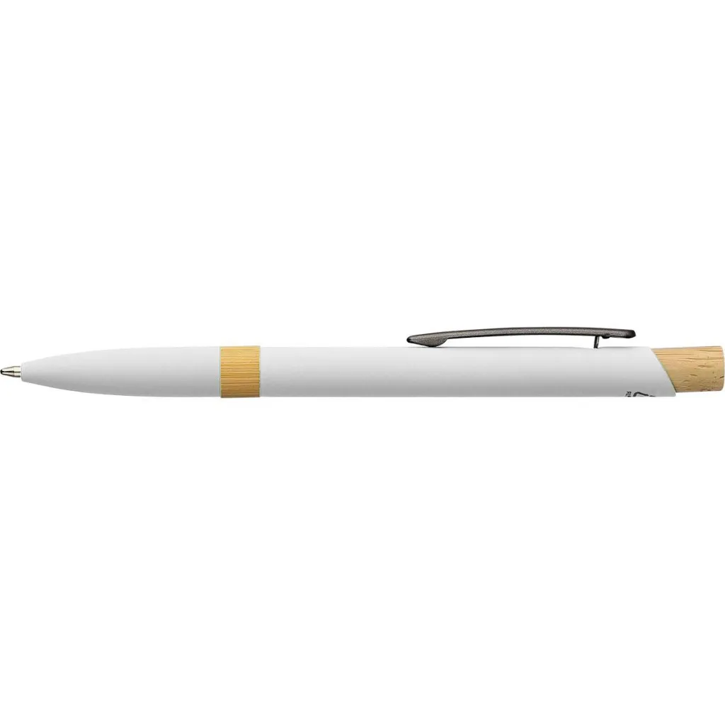 Kemijska olovka od recikliranog aluminija s gumiranom obradom, drvenim gumbom i bambusovim prstenom na tijelu. Ima mehanizam za pritisak, debljinu pisanja 1.0 mm i plavu tintu s približnom duljinom pisanja od 800 metara. Uključuje ugravirani logo od recikliranog aluminija.