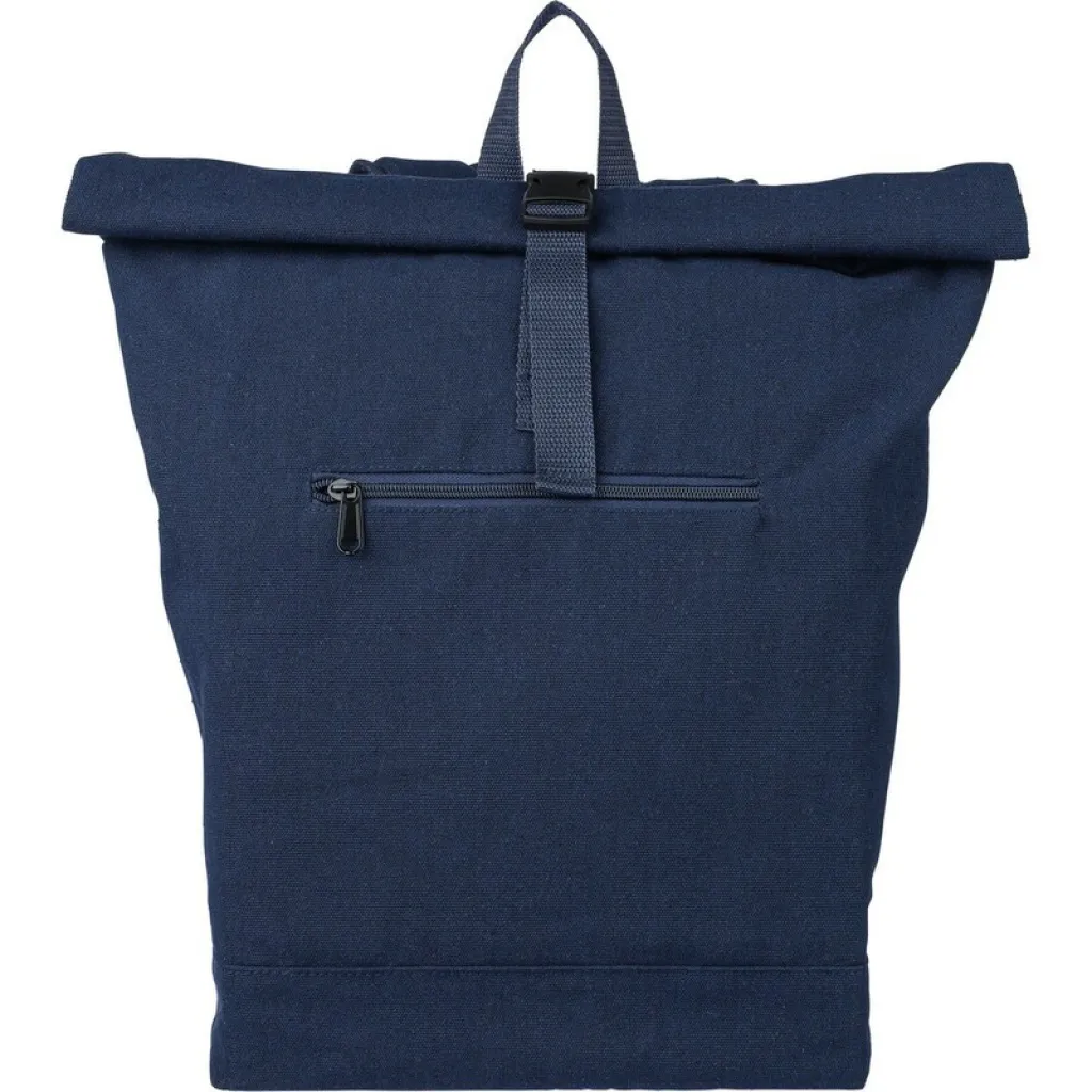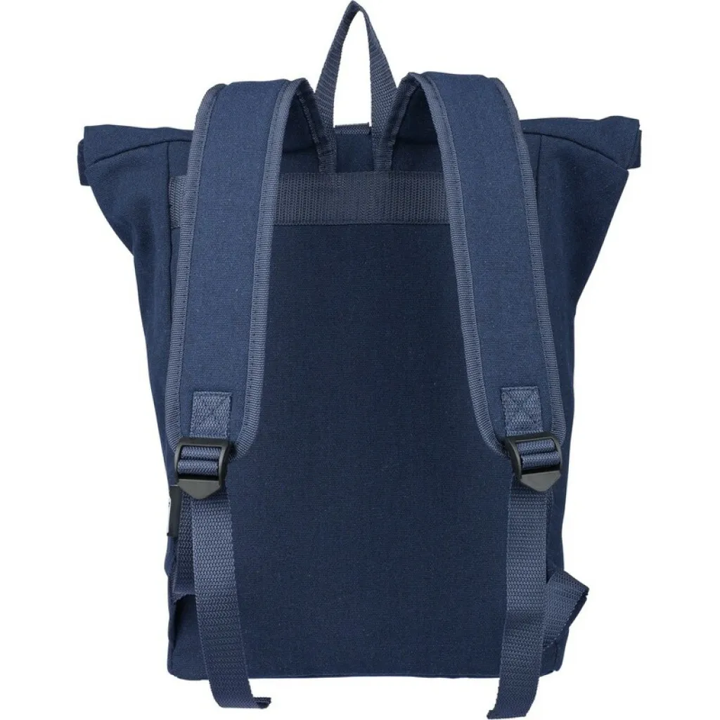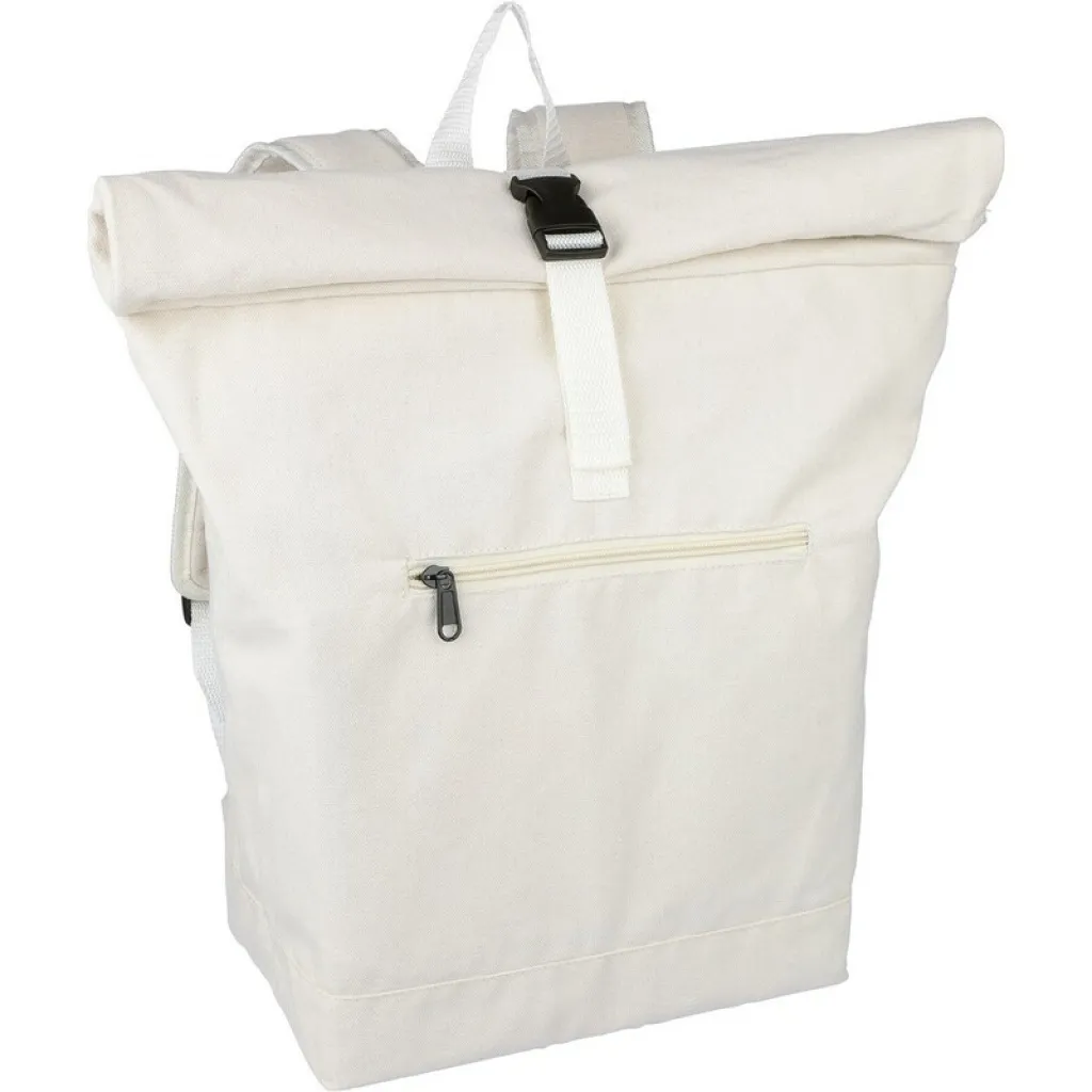 Rolltop ruksak, kapacitet 15L, veliki pretinac s patentnim zatvaračem, pretinac za prijenosno računalo od 15", dva unutarnja pretinca, jedan vanjski pretinac, dizajn uključuje omču za nošenje na vrhu, podstavljene podesive naramenice, mali prednji džep s patentnim zatvaračem, nosivost: 14 kg, proizvod izrađen od recikliranog polipamuka (330 gsm), podstava od 210D poliestera, zatvaranje plastičnom kopčom.