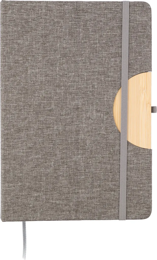 rPET (300D) notes (približno A5 format) s 80 stranica (70 g/m²) na crte. Preklopiva korica pretvara se u držač za telefon, s detaljem od bambusa na korici.
