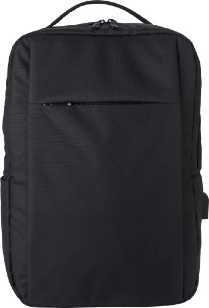 rPET (300D) ruksak za laptop (16 inča) s detaljima od 210D. Unutrašnjost s više džepova, džep za laptop s čičak zatvaračem, jedan prednji džep na patentni zatvarač. Otvor s USB-A priključkom na bočnoj strani.