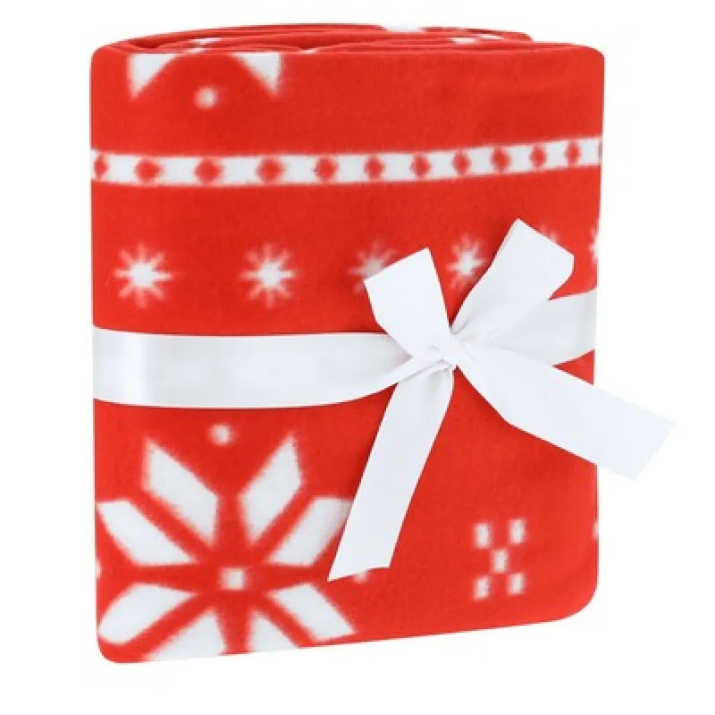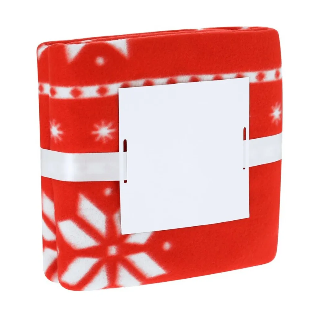 Deka s božićnim uzorkom. Sadrži posebnu etiketu za personalizaciju i ukrasnu traku. Materijal protiv pilinga. Proizvod od RPET poliestera 200 g/m2.