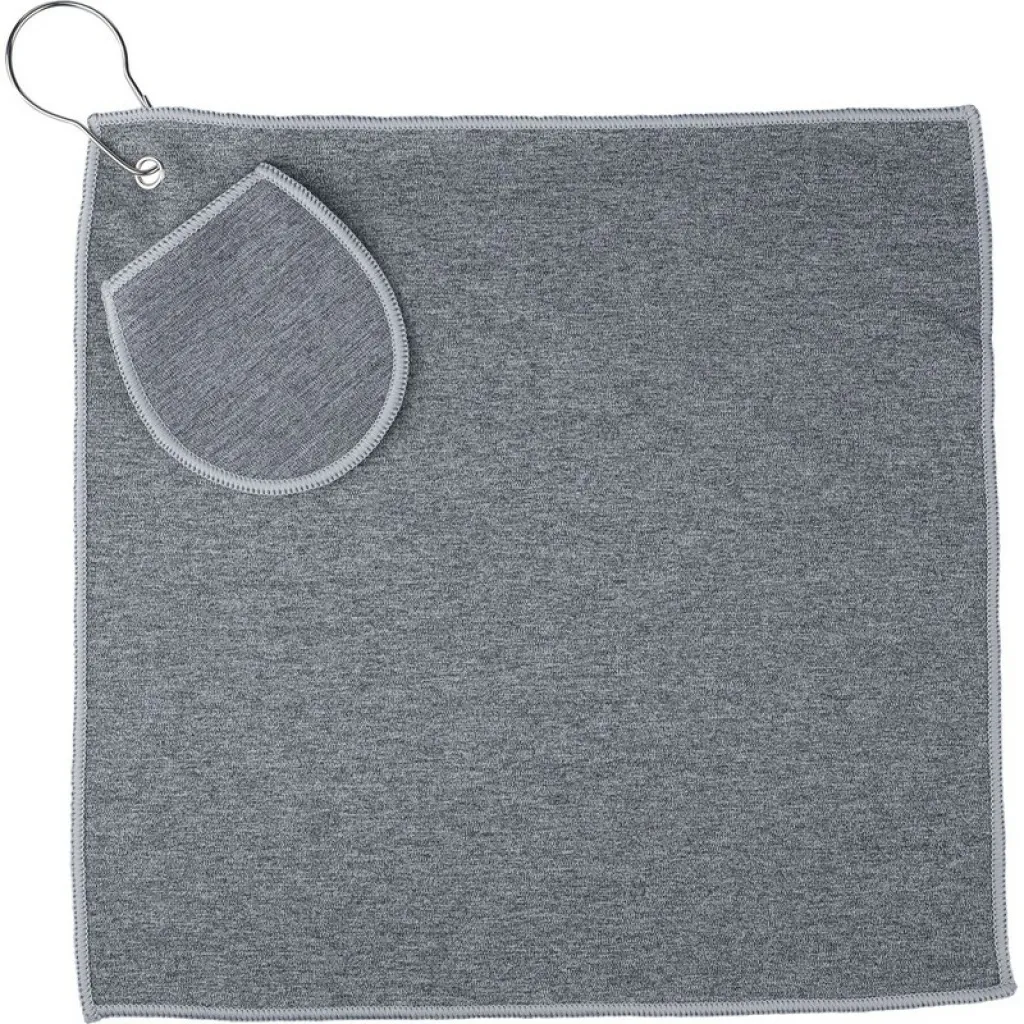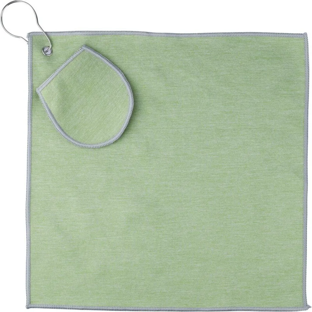 Golf ručnik s integriranim džepom za golf lopticu, opremljen metalnom omčom za jednostavno pričvršćivanje na torbu. Sadrži oznaku RPET na etiketi. Periv je u perilici rublja na hladno. Proizveden je od RPET materijala (reciklirane plastike).
