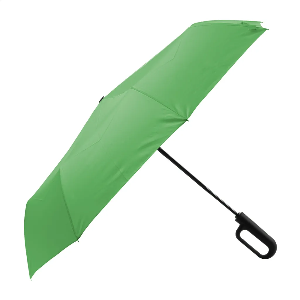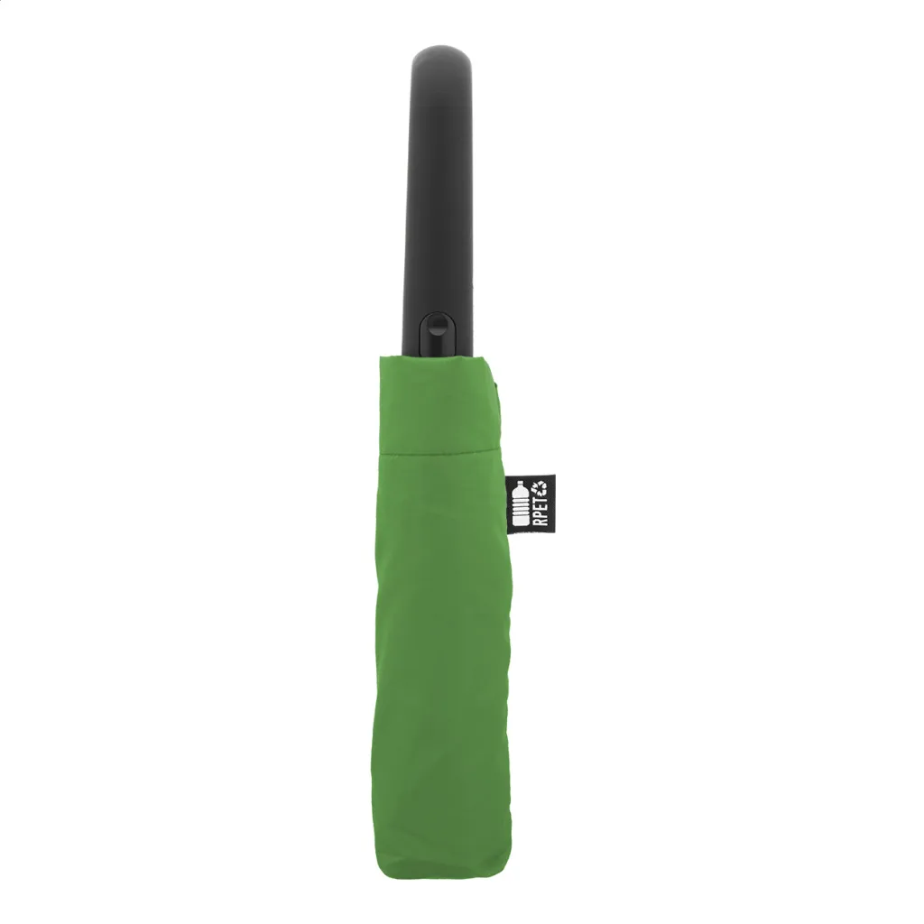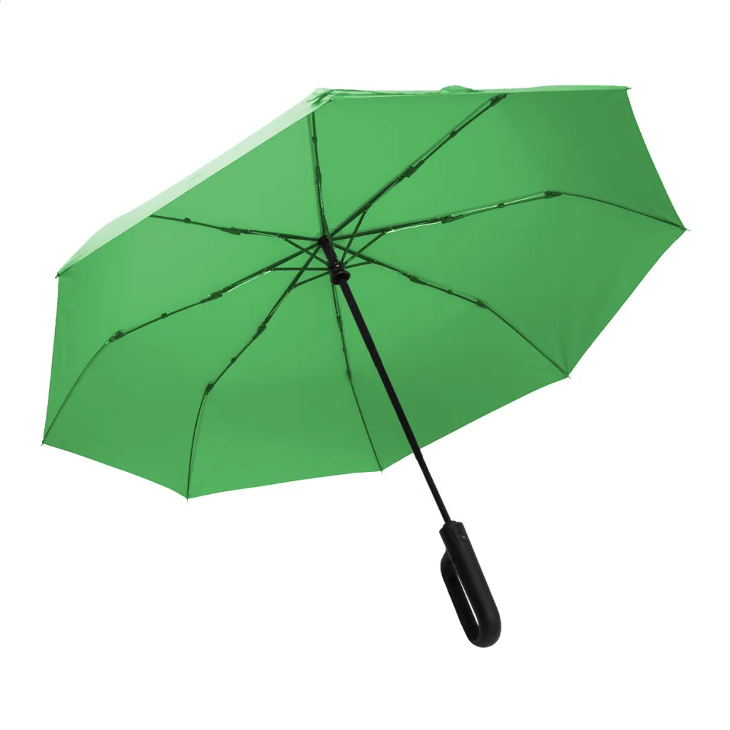 Potpuno automatski (otvaranje/zatvaranje), sklopivi kišobran otporan na vjetar s 8 panela u torbici iste boje. S metalnim okvirom, rebrima od fiberglasa i gumiranom karabinerskom ručkom. Od 190T RPET indijske svile. S prepoznatljivom RPET oznakom.