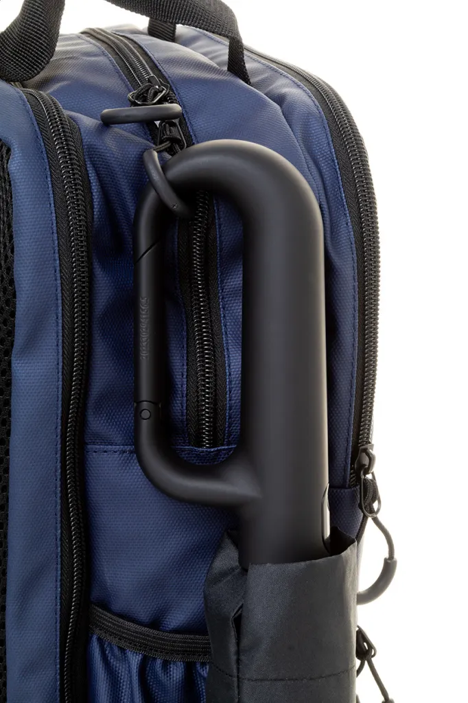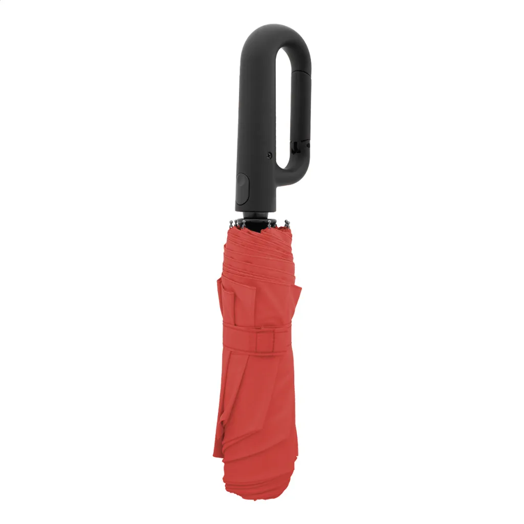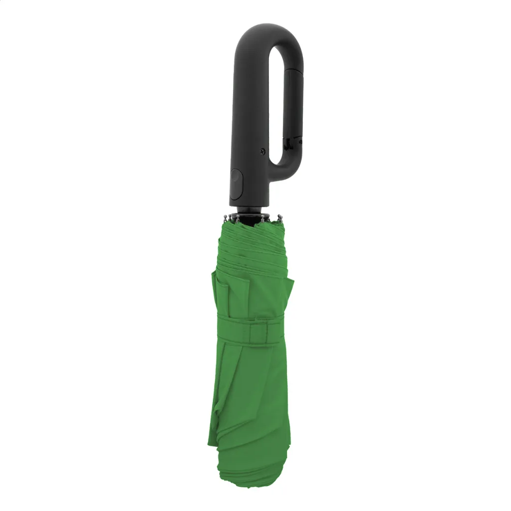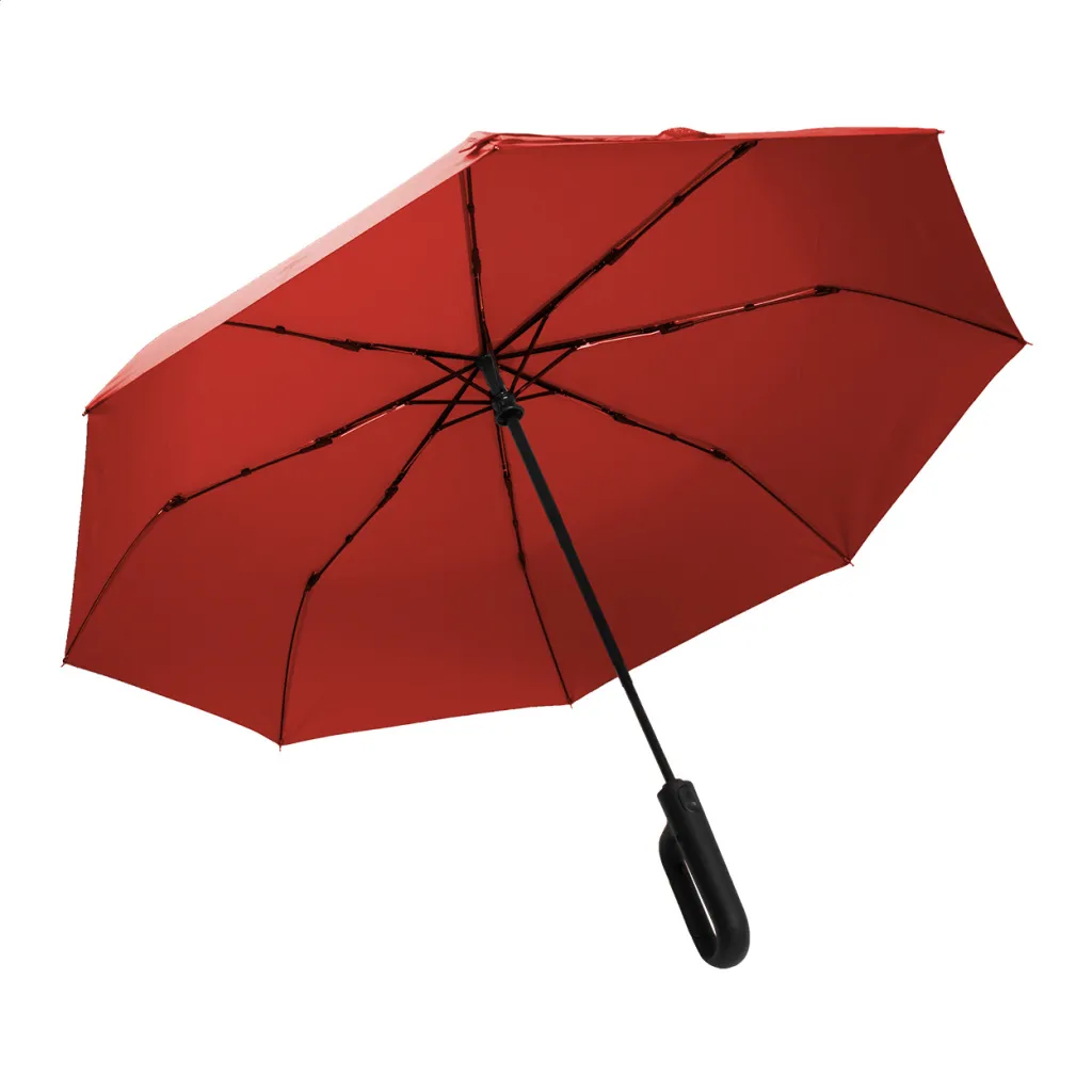 Potpuno automatski (otvaranje/zatvaranje), sklopivi kišobran otporan na vjetar s 8 panela u torbici iste boje. S metalnim okvirom, rebrima od fiberglasa i gumiranom karabinerskom ručkom. Od 190T RPET indijske svile. S prepoznatljivom RPET oznakom.