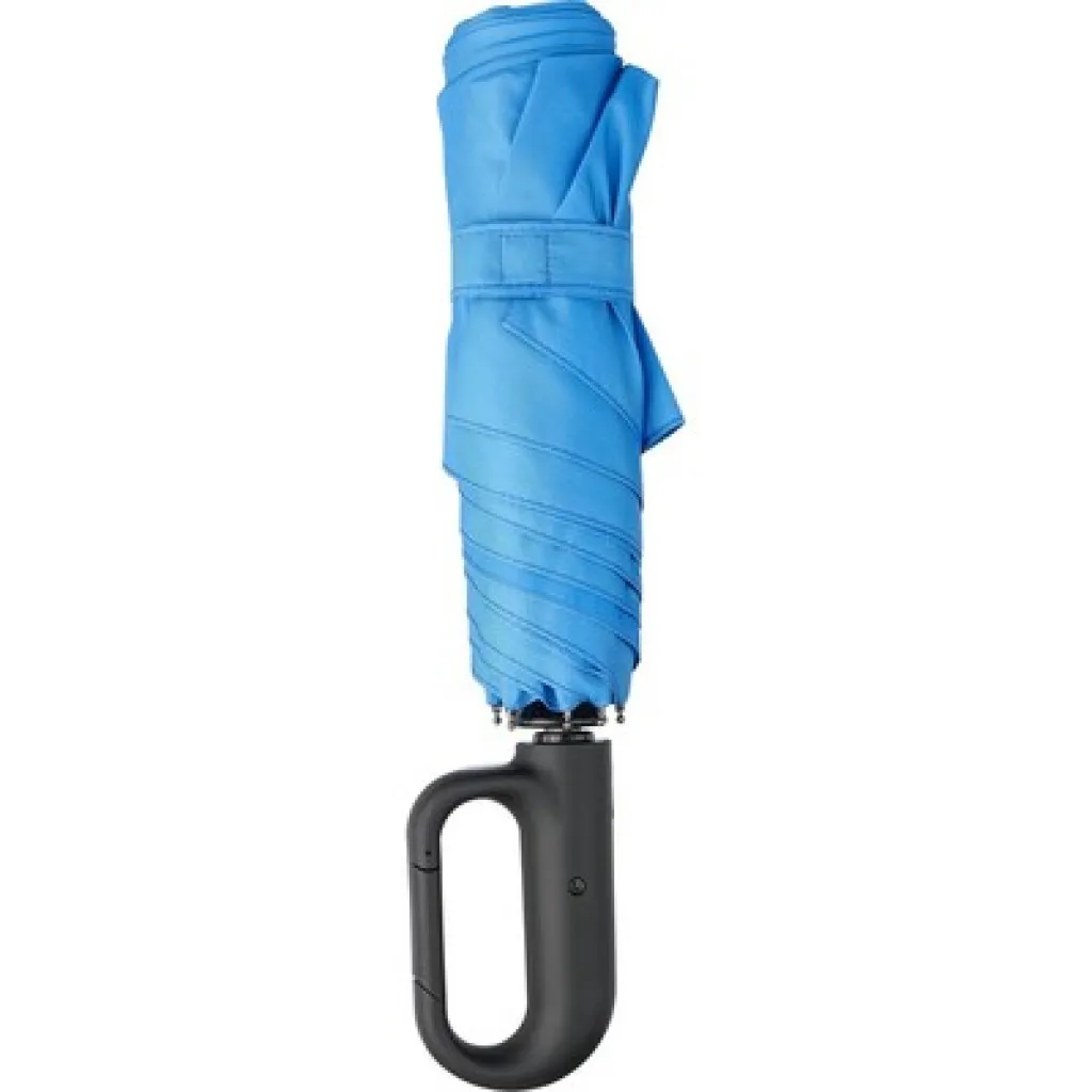 Kišobran s automatskim otvaranjem, sa 6 panela i RPET tkaninom. Sadrži RPET oznaku na etiketi, čičak traku i navlaku. S karabinerom koji omogućuje pričvršćivanje kišobrana na torbu tijekom putovanja. Vjetrootporan kišobran. Proizvod napravljen od plastike, RPET-a i fiberglasa.