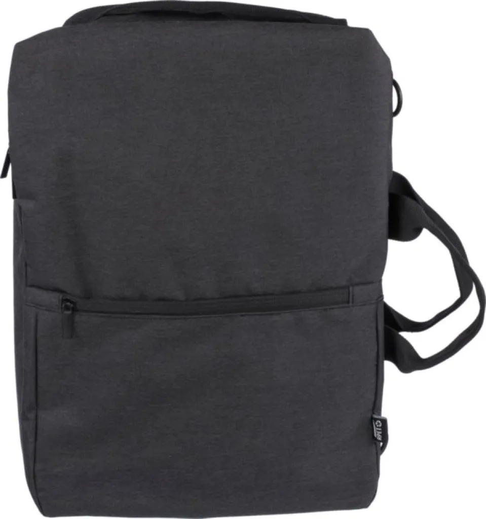 rPET poliesterski (300D) ruksak / torba za prijenosno računalo (15 inča) s podstavom od 210D. Odobreno za kabinu. S petljom za nošenje na vrhu, podesivim naramenicama i dva ručka za nošenje sa strane. Podesive trake mogu se skloniti iza podstave za funkciju nošenja s bočnim ručkama. Džep za prijenosno računalo sa čičak zatvaračem i mali džep sa zatvaračem. S ventiliranom podstavom za leđa. Nosivost približno 8 kg. Uključuje rPET etiketu.