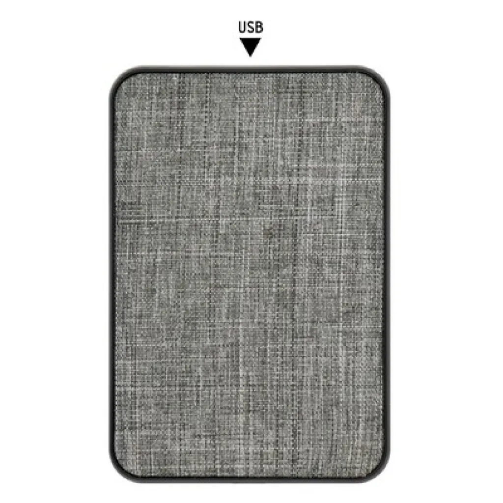 Prijenosna baterija (powerbank) 5000 mAh s prednjim dijelom od RPET poliestera, 4 diode koje pokazuju razinu snage, 2 USB izlaza (5V/2A), 2 ulaza (5V/2A): micro USB i USB tip C, mikro USB kabel uključen.
