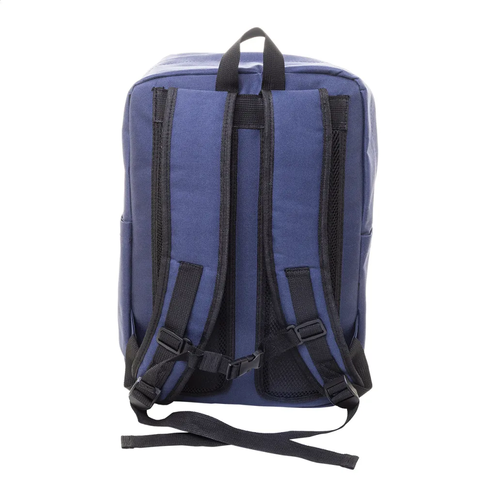 RPET ruksak s glavnim pretincem na patentni zatvarač, 2 prednja džepa na patentni zatvarač, bočnim džepovima i podstavljenim pretincem za prijenosno računalo (15") i tablet (10"). S podstavljenim leđima i naramenicama. 600D RPET poliester, s prepoznatljivom RPET etiketom.