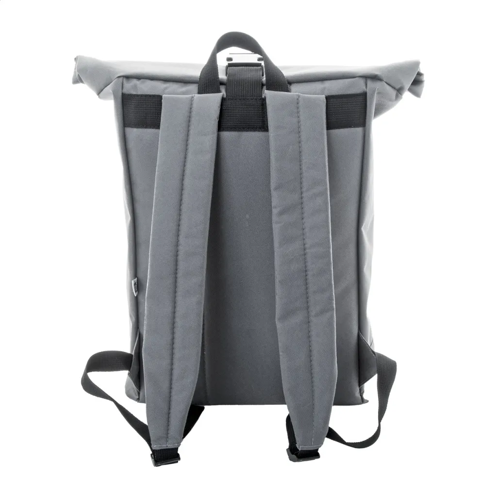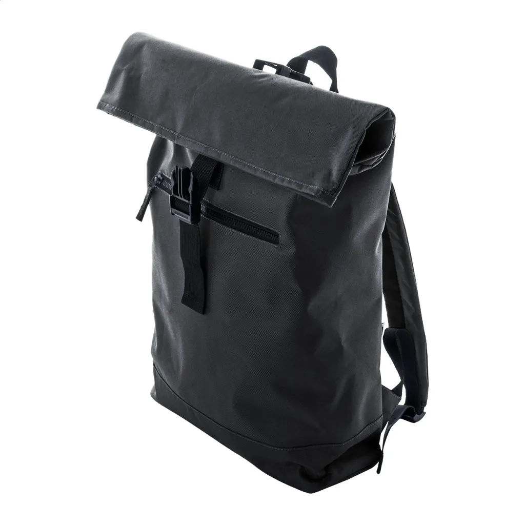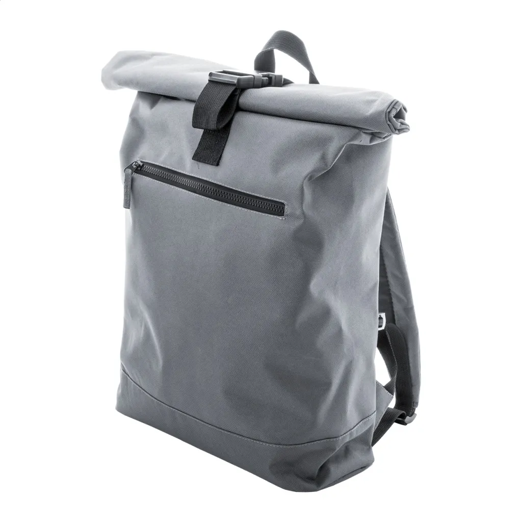 RPET rolltop ruksak s kopčom za zatvaranje, prednjim džepom s patentnim zatvaračem, podstavljenim pretincem za prijenosno računalo (15"), podstavljenim leđima i naramenicama. 600D RPET poliester s prepoznatljivom RPET oznakom.